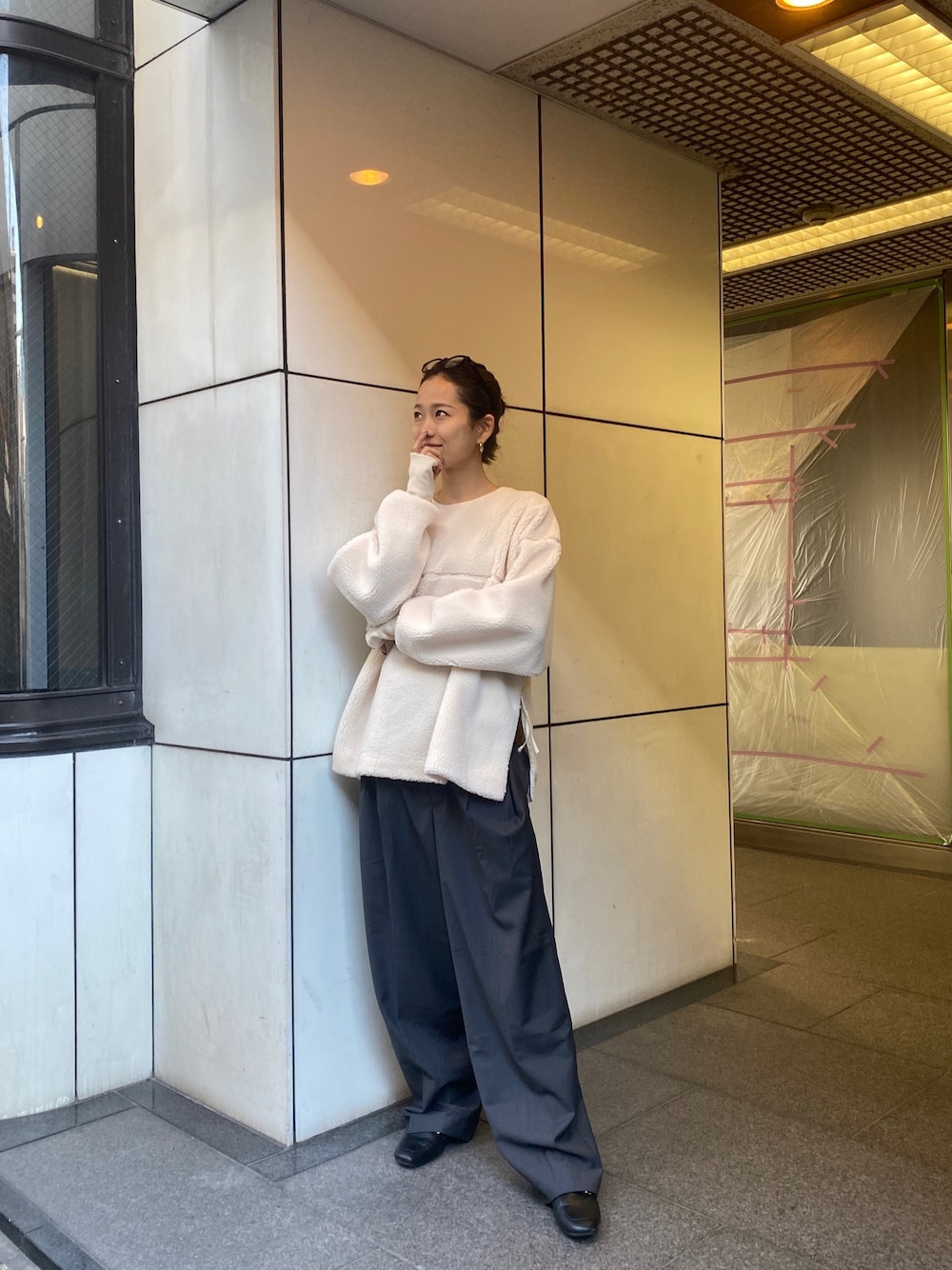 大人カジュアル出勤コーデ🌿 ゆったりとしたボアトップスに 緩めのパンツを合わせることで ラフだけとオシャレ見えしてくれるコーデです🙆🏽♀️
