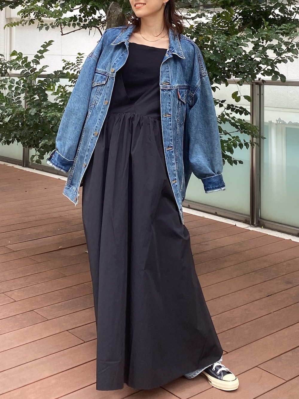 春のお出かけコーデ🌸 長さ調節のできるワンピースは小柄さんから高身長さんまで着ていただけます🫶🏾 胸元で切り替えがあるので スッキリしたトップスと合わせることで 広がりのお悩みもカバーしてくれます🙆🏽♀️ 大人気のデニムジャケットを合わせることでカジュアルな印象に👖 ヒップが隠れる丈の長さなので色々な形のボトムスと合わせていただきやすいです☺️