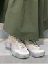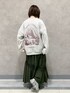 ゆるっと不思議な世界観のイラストが可愛いスウェット。首元や袖口にダメージ加工を施し、カジュアルに着こなせます。ボトムにはロングスカートを選び、女性らしいシルエットに。タフタ素材はスウェットとの相性も良く、軽い着心地で普段使いにぴったりです。足元はボリューミーなスニーカーでバランスを取るのがおすすめ。花柄ソールとシアーなチェックで、足元から春を感じられるコーディネートに仕上がりました。