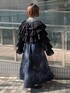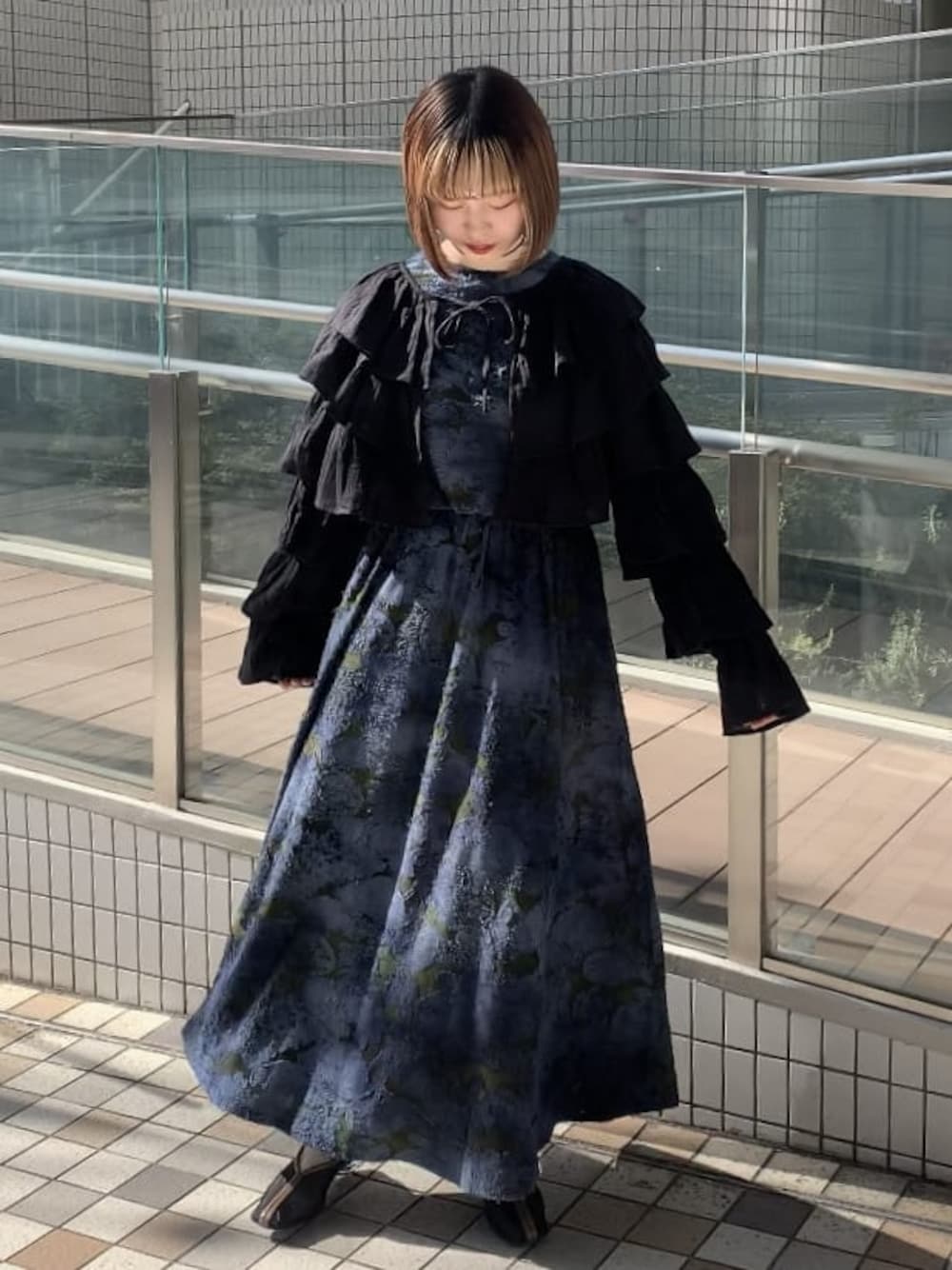 立体感のある生地と天然石のような色合いが個性的なワンピース。深みのあるネイビーに春を感じさせるグリーンが覗く、大人メリーさんにおすすめのカラーです。柔らかく伸縮性に長けた素材で着心地もよく、ウエストゴムのため体系問わず可愛く着て頂けます。薄手のカーディガンをさらっと羽織れば、春のお出かけにぴったりの綺麗めコーデに。ふわっと重なるフリルで、後ろ姿までばっちり決まります。
