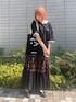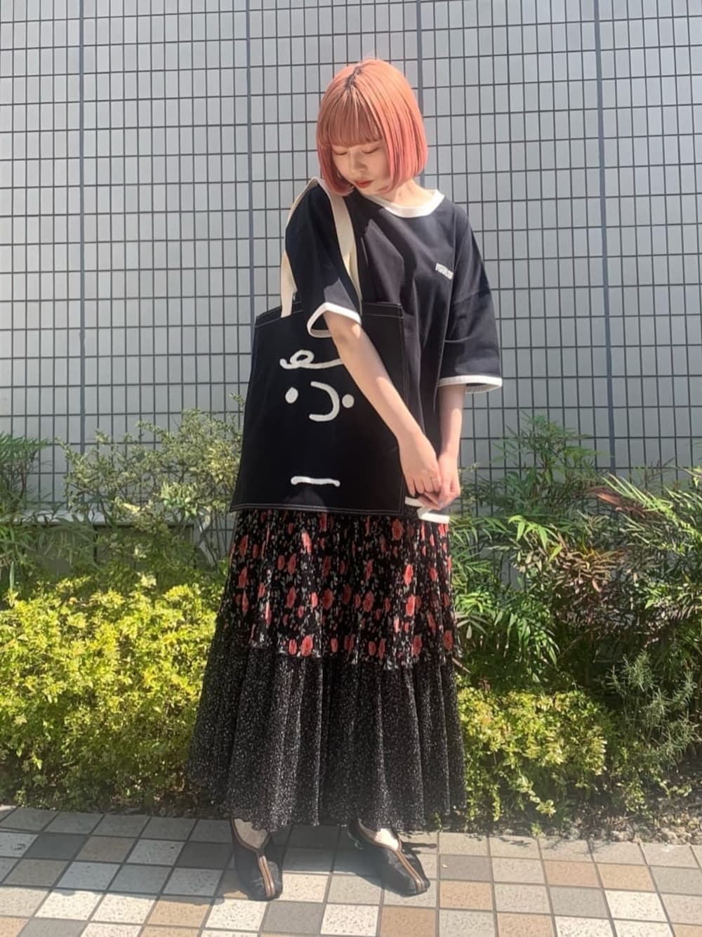 バックプリントが可愛いコラボTシャツ。ゆるっと楽に着られるので、お出かけにはもちろん、おうち時間にも活躍します。デザインが際立つブラックは、ボトムに花柄スカートを選んでガーリーさをプラス!軽い素材のスカートなので、オールブラックでも重たく見えません。