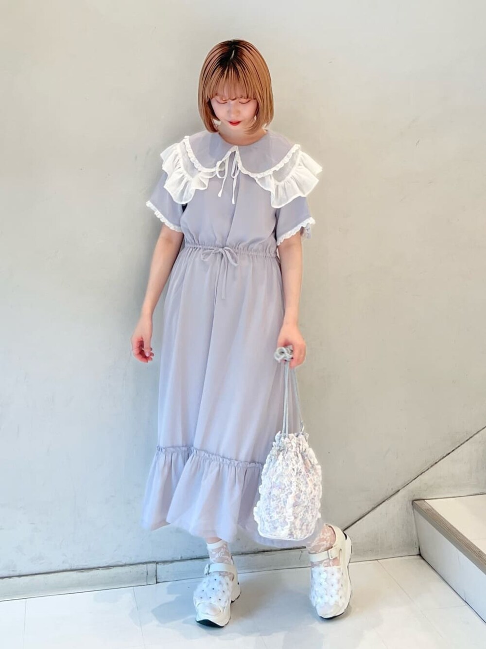 涼しげなパステルカラーが可愛いジョーゼットワンピース。さらさらとした素材で、暑い夏も快適に過ごせます。シワになりにくく、お手入れが簡単なのも嬉しいポイント!シンプルなデザインとカラーなので、お出かけはもちろん、通学通勤などデイリーユースにもぴったりです。今回はフリルカラーをプラスしてとびきりガーリーに。サンダルやバッグなどの小物も淡いカラーでまとめると、ふんわり夏らしいスタイリングになります。