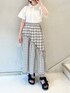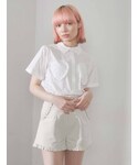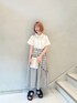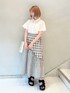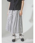 店頭でもさっそく大人気のシャツを使った、定番ガーリーコーデ。なんと言っても胸元のハートポケットが個性的!シャツ襟なので可愛すぎず、スカートはもちろんパンツスタイルにも合う、万能アイテムです。スカートは、アシンメトリーなフリルと大きさの違うチェック柄が珍しく、遊び心のあるデザイン。グレーに近い淡めのブラックなので、重たく見えず、夏にぴったり!低身長さんでも楽に着こなせる丈感です。