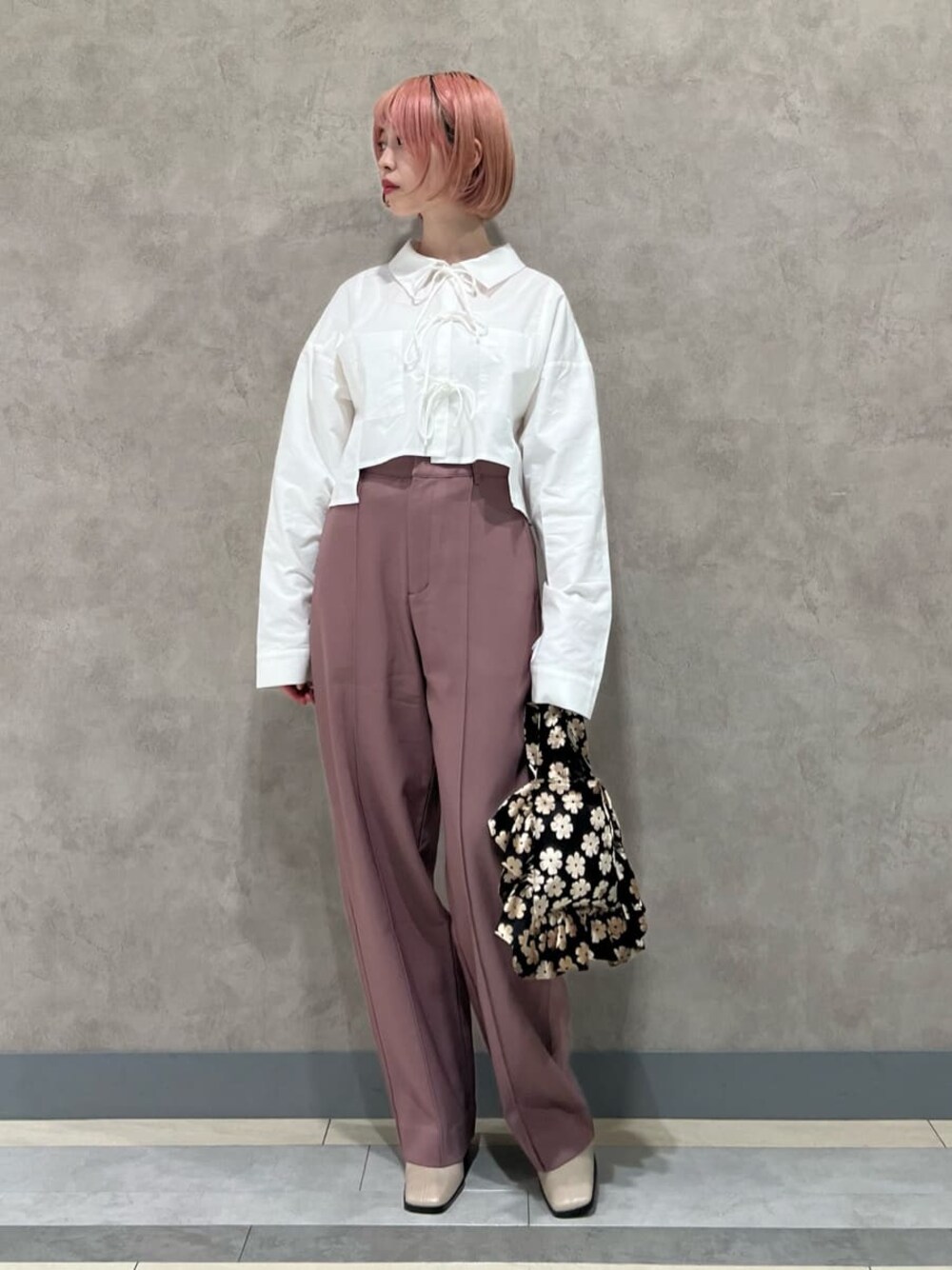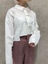 シンプルながら、切り替えデザインや連なったリボンがユニークなショートシャツ。絶妙な丈感でパンツスタイルにもぴったり!カラーパンツを合わせるとメリハリが付き、スタイルアップも叶います。パンツはSサイズ着用です。ベルトを通せるのでウエストが心配な方も履きやすいデザイン。センターシームで縦ラインを強調してくれて、こちらもスタイルアップ効果抜群!オールシーズン活躍する万能アイテム、ぜひお気に入りのカラーをゲットしてください♡