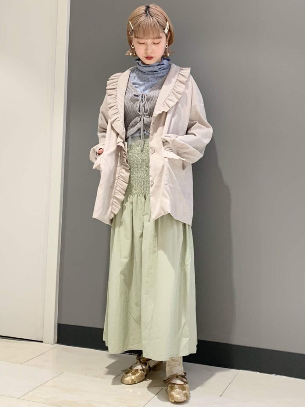 爽やかなブルー×ミントグリーンをメインに、小物で遊び心をプラスしたコーデ。タートルはサラッとした素材で、少し肌寒い今の時期にちょうど良く、タイトではないので体型気にせず着て頂けます。シャーリングがユニークなロングスカートは、ハリのある素材でシルエットが綺麗♡オーバーサイズのジャケットをサッと羽織ってちょっぴりカジュアルに。