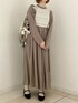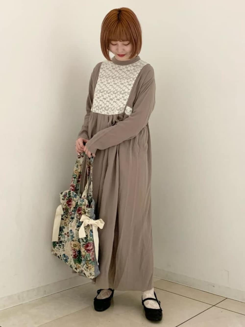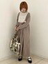 ビスチェのようなレースが目を惹くワンピース。てろんとした柔らかい素材で肌触りがよく、着心地抜群です。落ち着いたカラーとロング丈で少し大人っぽい印象です。レースの甘さがうまく中和され、年齢問わず着やすいアイテムですね。バッグはジャガードとキルティングが合わさった贅沢なデザイン!たっぷり入る大きさで使いやすく、一気に秋冬感をプラスしてくれます。シューズはブラックを選び、すっきりシンプルなコーディネートにしました。