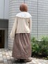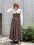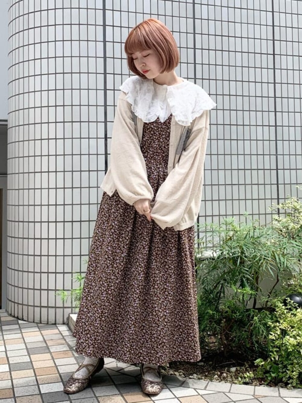 ホワイト×ブラウンでまとめた秋コーデ。ワンピースは、一気に季節感をプラスしてくれるコーデュロイ。小花柄とロング丈で、古着のような可愛らしさです。ブラウンはサイドボタンとお花がパープルになっています。個性的な配色で、楽ちんなのにこなれ感UP♡中のブラウスは、大きな襟がポイント。主張しすぎない花柄の刺繍で、着回し力◎カーディガンからも襟を見せてとことんガーリーな着こなしに。ふわふわもこもこな手触りが人気のカーディガンは、今季も注目のアイテム!ゆるんっとした袖が可愛らしく、重ね着もしやすいです。シューズはちょっぴり大人っぽいスパンコールのフラットシューズを合わせて引き算を!