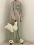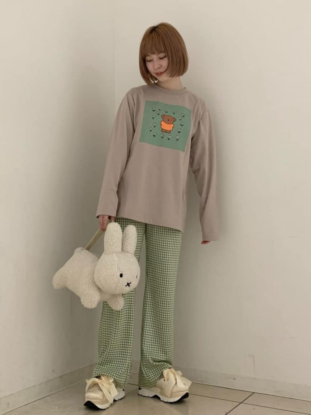 ミッフィーコラボにロンTが登場!淡いカラーリングとスクエアプリントが可愛いです。カジュアルなTシャツコーデもこれならガーリーに♡ゆったりサイズで着心地も良く、普段使いのほかに、おうち時間でも活躍してくれそう。今回はグリーンのチェックパンツと合わせ、カラフルで楽しげなスタイリングに。トレンド感あるフレアシルエットはタイトな履き心地のイメージですが、こちらはかなり伸縮性があるので、体型問わず履きやすいです。人気のバッグとスニーカーでmerry jennyらしい個性を散りばめました。