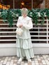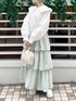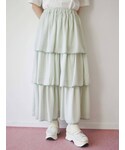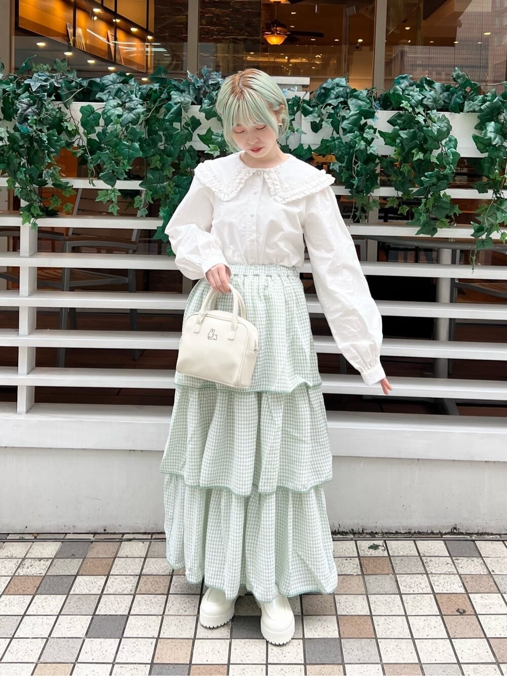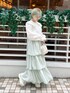 襟付きブラウスにボリューミーなティアードスカートを合わせたmerry jenny定番のスタイリング♡ ブラウスは、ホイップクリームのような立体感のあるフリルと、ボリュームスリーブがガーリーコーデにぴったりです。しっかりとした厚手の素材で、これからの時期活躍すること間違いなし。スカートはシワになりづらい素材と、ウエストゴムで楽な着心地。シーズン問わず使えるのも嬉しいですね。