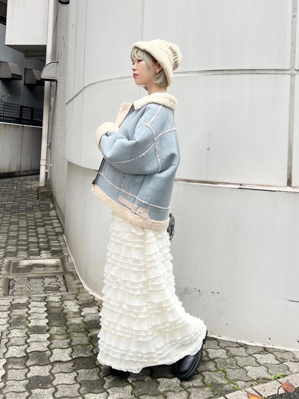 明るいパステルブルーが新鮮なムートンジャケット。さっと羽織るだけで、暗くなりがちな冬コーデを華やかに見せてくれます。軽くて柔らかい着心地で、デイリーに使えるのが嬉しいポイント!全体的にゆとりのあるサイジングなので、トレーナーや厚手ニットの上に着てもごわつかず、防寒もばっちり。今回はキャミワンピースと合わせてメリハリのあるシルエットに。