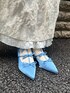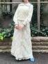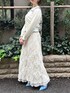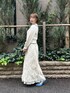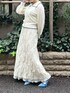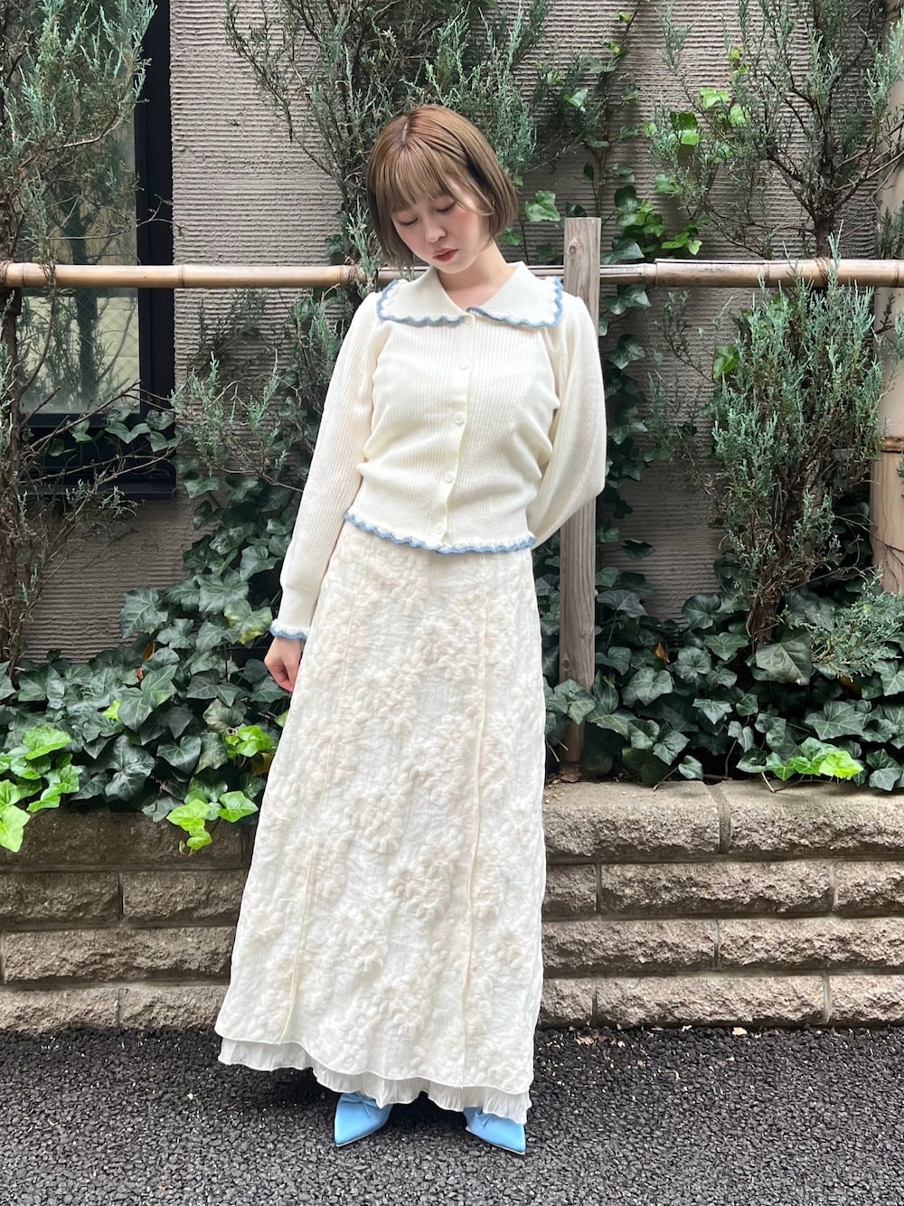 オールホワイトにブルーを効かせた大人merryコーデ。キャミワンピの上にトップスを重ねて、スカートのように着用しています。カーディガンは、ガーリーなスカラップとすっきりとしたネック部分がポイント。キャミワンピは、シアーなdaisy柄が可愛らしく、チラッと裾から覗く裏地もこだわりのデザインです。