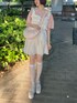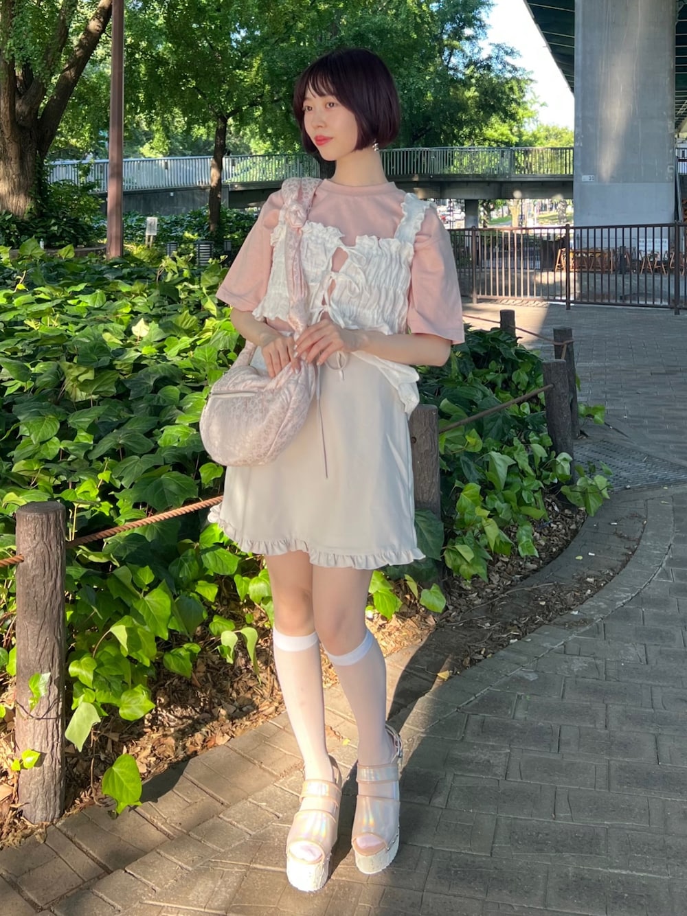甘めピンクのガーリーコーデ♡ (トップス)ラフに着られるオーバーサイズのTシャツは、夏のマストアイテム!今季は淡いピンクでガーリーに着るのがおすすめ♡長めの袖丈で気になる二の腕や肩幅をカバーできます✨胸元とbackには刺繍入りで、一枚で着てもバッチリ可愛く決まります♡ (ビスチェ) ギャザー部分がゴムなので伸縮性があり、締め付け感ゼロ✨ワンピース、Tシャツ…いつものコーデに付けるだけでこなれ感アップ! (スカート)ウエストゴムで伸縮性があり、オーバーサイズのトップスをインしても楽な着心地です。シワになりにくく、お出かけにぴったり!♡ (シューズ)厚底で足を綺麗に見せてくれるのに、とっても軽い履き心地です!店頭で1日中立っていても大丈夫なぐらい安定感があり、靴擦れもしにくいです。23.5cmでMサイズ着用です。