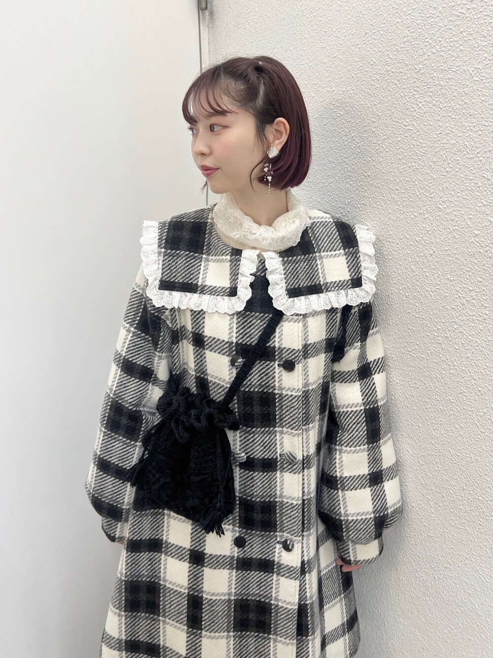 (アウター)一枚で主役級✨大きめのセーラーカラーで後ろ姿までバッチリ可愛く、小顔効果も抜群です。ゆったりとした着心地で、中にトレーナーや厚手ニットを着込んでもごわつきません。一枚で映える特別感のあるデザインで、冬のお出かけにぴったり!今回はモノトーンでまとめてシックな印象に。 (バッグ)ちょっとしたお出かけに便利なミニポシェット。ウォレット、スマホ、コスメなど、意外とたくさん入るサイズ感です。ショルダーの調節ができるのでアウターの上からも付けられます。さりげないお花のデザインがmerry jennyらしいポイントです。 (シューズ)トレンドのボリュームソールにフリルを付けて、ガーリーなお洋服にもぴったりな一足。23.5cmでMサイズ着用です。
