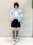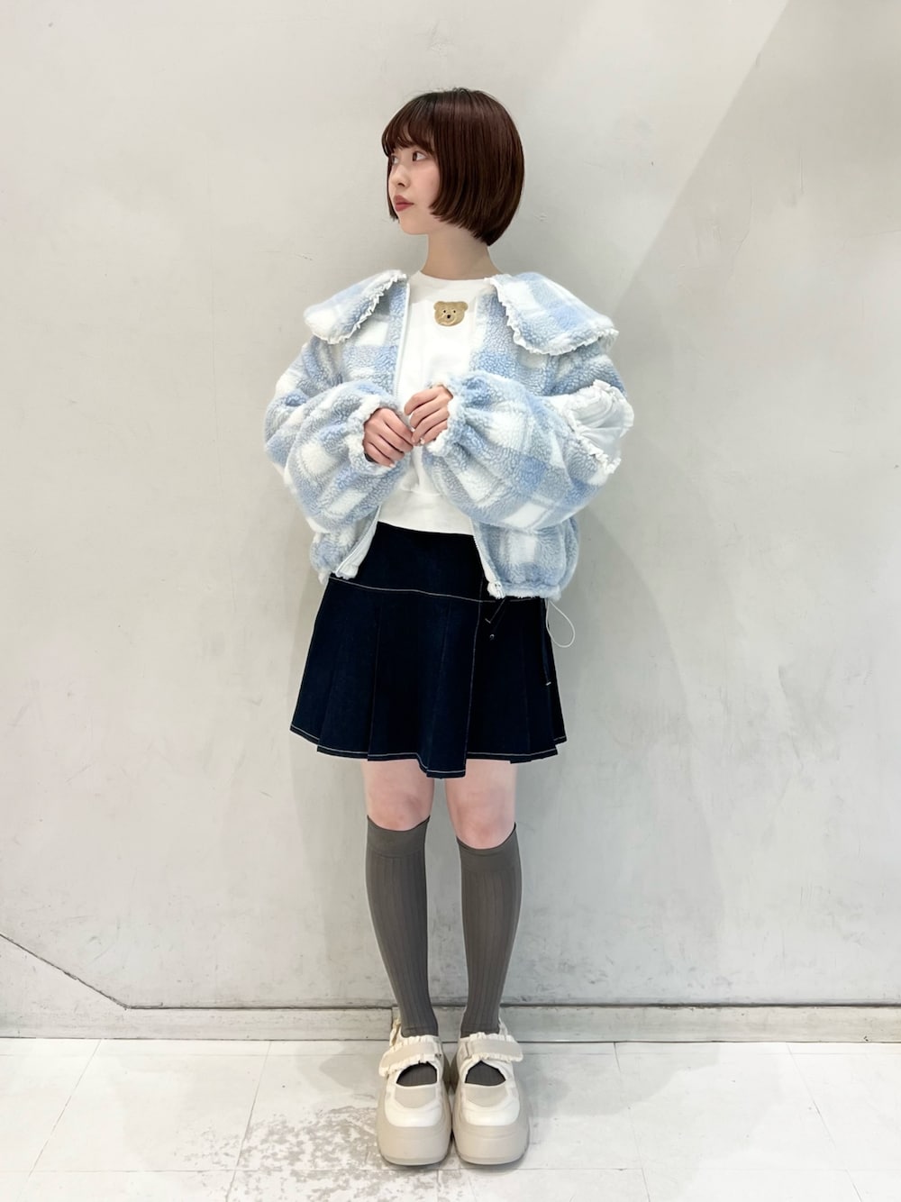 (ジャケット)店頭でも大人気✨ カジュアルにもガーリーにもマッチするボアジャケット♡ とっても軽い着心地なのに暖かさもバッチリで、お出かけはもちろん普段使いにも活躍すること間違いなし。 少し短めの丈感と、裾のドロストのおかげで、バランスよくすっきりと着こなせます。 ゆとりのあるサイズ感で、重ね着しても着膨れしません。 (トップス)ショート丈×ボリュームスリーブでスタイルアップ効果も◎ アウターからちらりと覗くbearがコーデのポイントになります。 (スカート)定番人気のデニムスカート。 オールシーズン着られて着回し力抜群です。 綺麗な台形シルエットと太めのプリーツが、気になる太もも周りをカバーしてくれます。 (シューズ) トレンドのボリュームソールにフリルを付けて、ガーリーなお洋服にもぴったりな一足。23.5cmでMサイズ着用です。