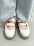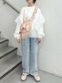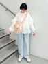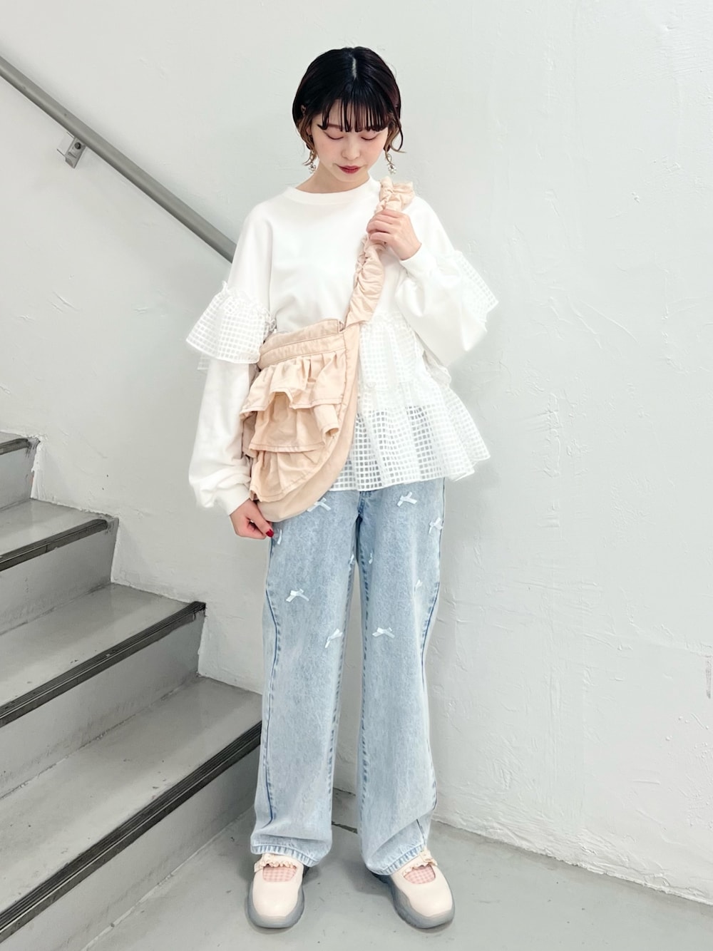 (トップス) たっぷり立体感のあるフリルが可愛いデザイン♡ ラフな印象のトレーナーコーデも、これなら着るだけでお洒落見え♡ ふんわりとしたスリーブで女の子らしさ満点です。 淡いベビーピンクは春コーデに欠かせない定番カラー! (デニムパンツ)小さめリボンがポイント♡さりげない可愛さで、どんなコーデにも合います。少し長めの丈感で、厚底スニーカーとの相性抜群!ウエストは後ろのみゴム仕様で、楽な履き心地。 (シューズ)可愛いのに軽くて疲れにくいのが嬉しい。お手入れ簡単なラバーソールで、普段使いや旅行にもぴったりです。ストラップでサイズ調節ができ、安定感のある履き心地。23.5cmでMサイズ着用です。 (バッグ)両手が空くショルダーバッグは、お出かけにぴったり!かわいい見た目ながら大容量なのが嬉しいポイント🥇