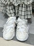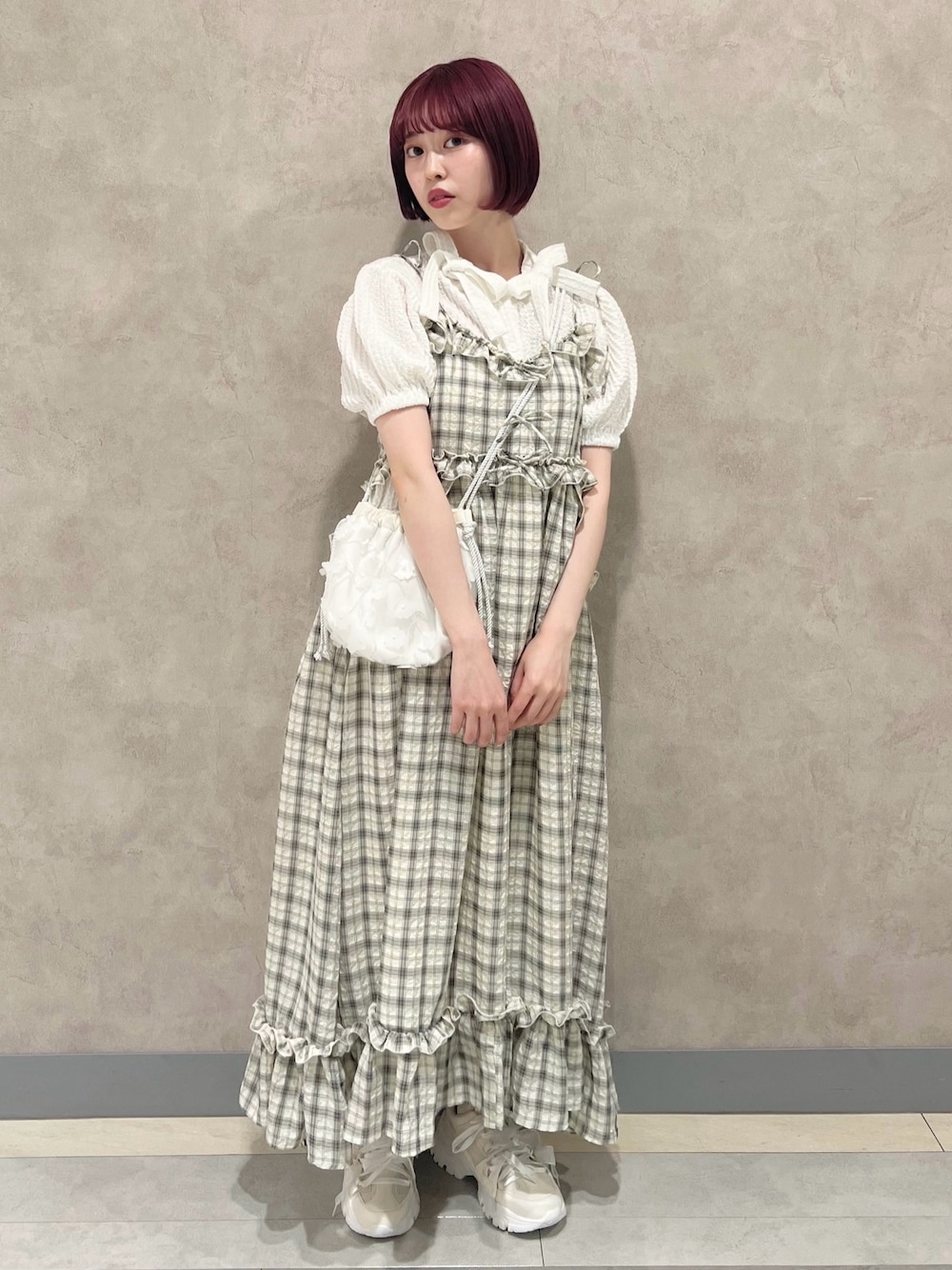 人気No.1ワンピース✨ (ワンピース)さらっと涼しい素材が夏にぴったり。肩紐で丈の調節が可能です。フリルの切り替えでウエスト位置が高く見えます。サイドのさりげないデザインが可愛い♡裏地付きでインナーを選びません。 トップス次第でかなり印象が変わるので、着回しを楽しめます。 (ブラウス)ぽこぽこ立体感のあるふんわり柔らかい素材です。夏用の涼しいブラウスをお探しの方におすすめ!襟元のリボンが他にないユニークなデザインです。袖丈長めで、気になる二の腕もしっかりカバー♡ (シューズ)自分でカスタムしたようなデコラティブなデザインが今っぽい! オーガンジーリボンを解いて、シンプルにも使えます。 23.5cmでMサイズ着用です。