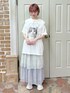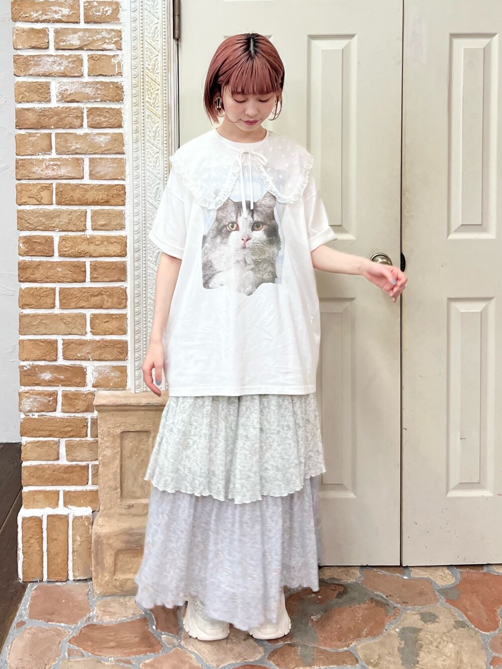 (トップス)オーバーサイズで楽な着心地。 袖丈、総丈が長めで、気になる二の腕やヒップまでカバー。ちょこんと前足を出した猫がキャッチーなデザイン♡ (スカート)merry jenny定番のティアードスカートに新色が登場♡ふわふわ軽やかな素材と、春夏にぴったりの淡いカラーがかわいいです。ウエストゴムで楽ちんな履き心地。両サイドにはポケット付きです。 (シューズ)パンツスタイルとの相性抜群なボリュームソール。軽い履き心地でお出かけにぴったりです。23.5cmでMサイズ着用です。