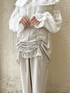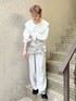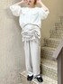 (トップス)シアー素材にふわふわのシャギーがユニークなシャツ。オーバーサイズで羽織としても活躍します。夏場は日除けや室内での冷房対策としても◎大きめの襟で小顔効果抜群です🌟袖口はゴム仕様です。 (ボトム)光沢感のあるサテンパンツは、取り入れるだけでシックな印象に。 トレンドのデザインを取り入れつつも、飽きずに長く着られるシンプルさが◎ウエストは後ろのみゴムになっていて、楽な履き心地です。スカート部分はギャザーの寄せ具合によって丈を調節できます◎ (シューズ)幅が広めで楽な履き心地。ベルトでサイズ調整が可能です。トレンドのメタリックを可愛らしく取り入れられます。