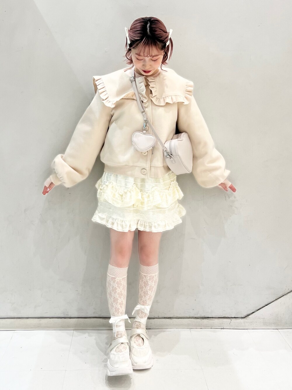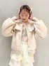 (アウター)ブランド定番人気のアウターが、今年らしい短丈に♡ミニボトムや厚底との相性抜群で、羽織るだけでスタイルアップ♡大きめのセーラー襟で、どこから見ても可愛いスタイリングになります。 (トップス)ふわふわのシーズーがコーデのポイントに♡裾がリブになっていてボトムにインしてもすっきり見えます♡サムホール付きでアウターからちらっとのぞかせるのも可愛い♡ちくちくしない素材で、伸縮性もあるので着心地の良さも◎ (スカート)光沢感のあるベロアが冬にぴったり。ウエストはゴムになっています。フリル付きでトップスインしても可愛いデザイン♡ (シューズ)レースアップのリボンは取り外し可能な2way仕様! ベルクロで着脱も楽ちんです。軽いソールで長時間履いても疲れにくく、たくさん歩くお出かけにおすすめ♡