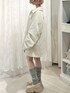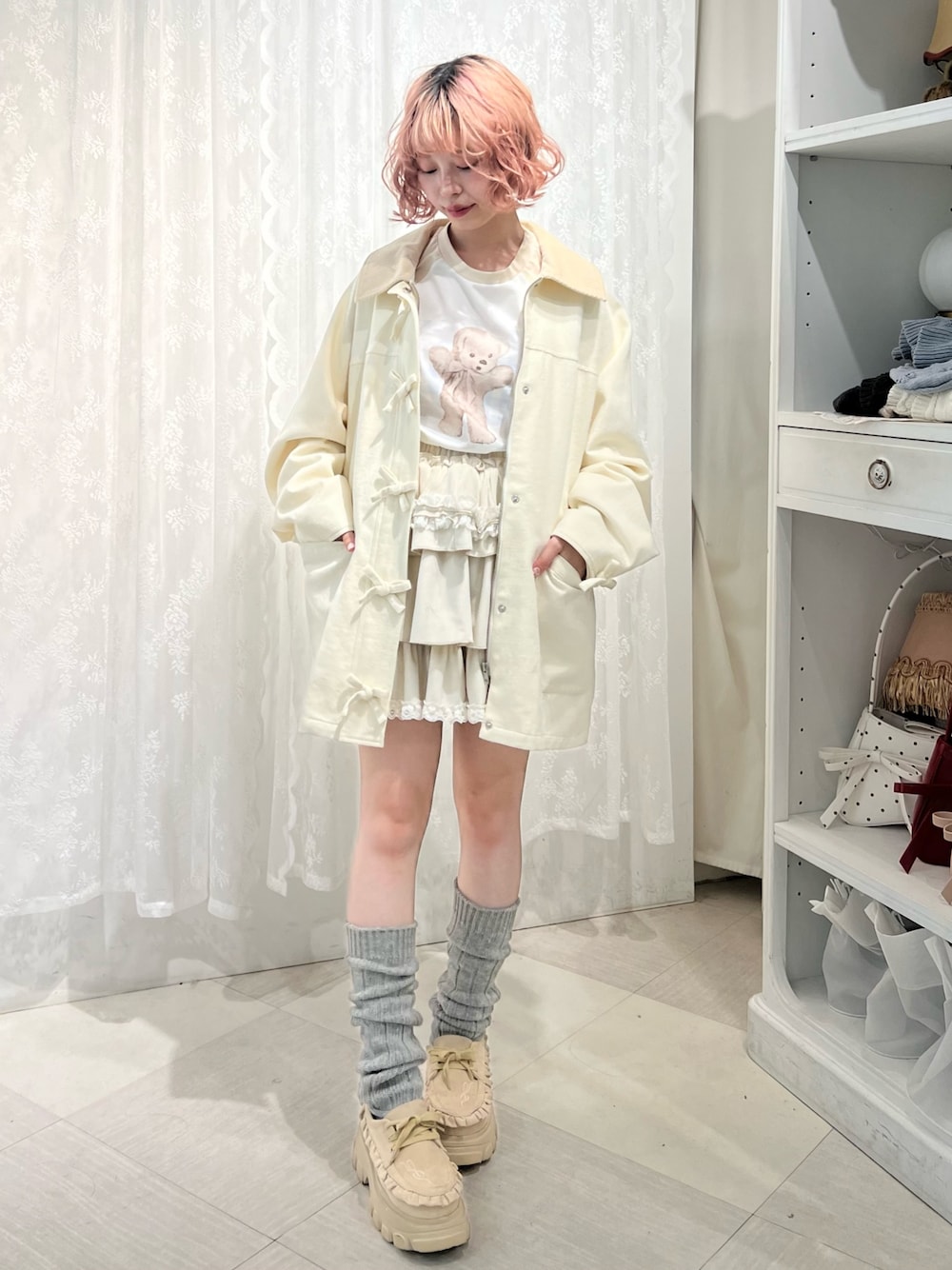 (ジャケット)シンプルなカラーリングでコーデを選ばず、オーバサイズでさっと楽に羽織ることができます。カジュアルにもガーリーにもマッチするので、様々な系統を楽しみたい方や、普段使い用にアウターをお探しの方におすすめです。裏地はポリでさらっとしているので、厚手のニットやトレーナーの上に羽織ってもごわつきません。ヒップが隠れる丈感で、ミニ丈やロングブーツとの相性も○ (スカート)ボリュームのあるティアードがヒップや太もも周りをふんわりカバーしてくれます。秋冬感のある素材もポイント。ウエストゴムで楽な履き心地です。 (シューズ)23.5cmでMサイズ着用です。