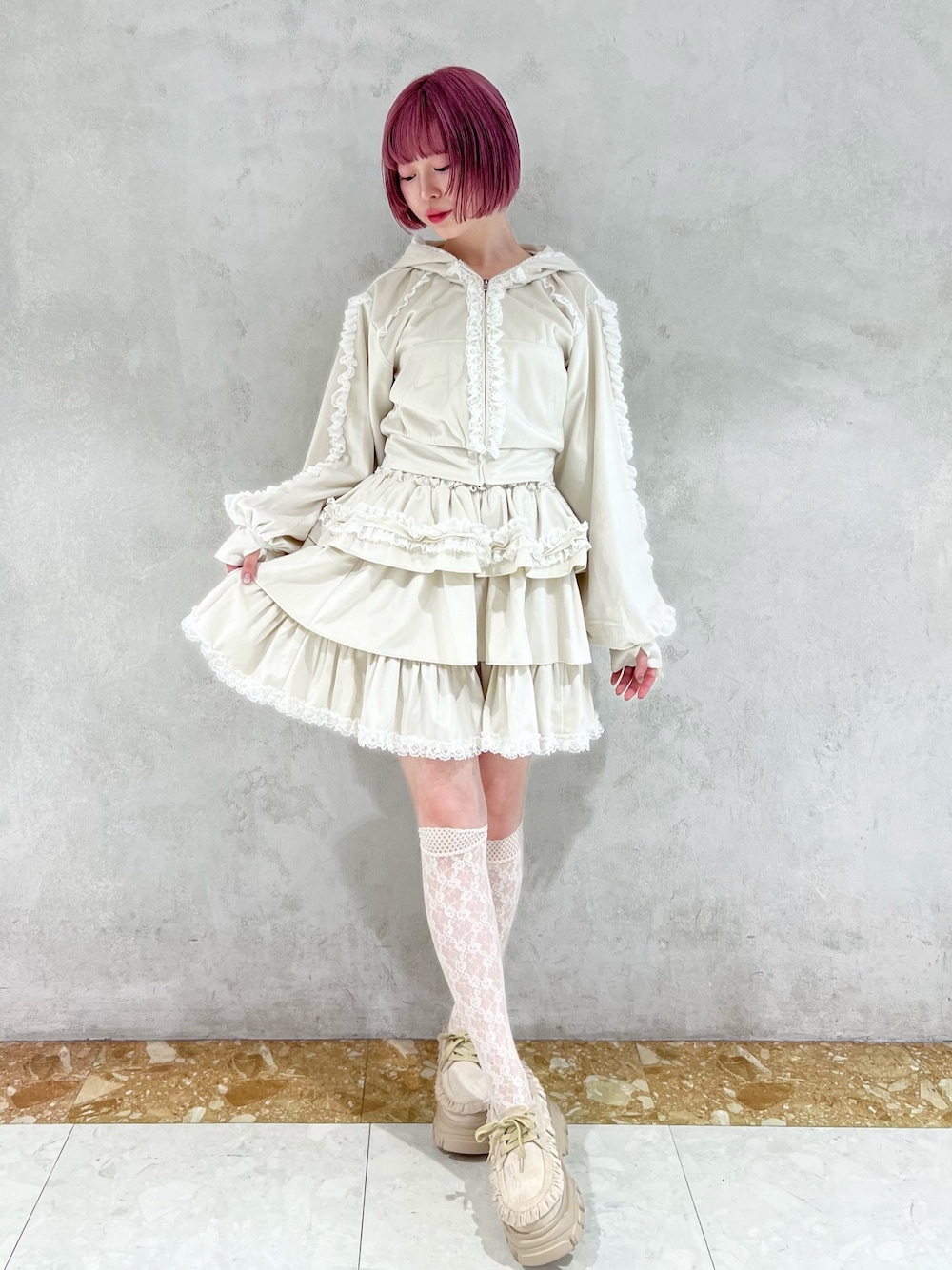 (トップス)トップスとしても、軽い羽織としても使えてとっても便利♡ サムホールがアクセントになります。 ショート丈で着るだけでスタイル良く見せてくれるのが嬉しい!✨ バックは太めのゴムが入っていて伸縮性があり、コンパクトですが楽な着心地です。 首元がスッキリ見えるのもポイント。 大きめフードで小顔効果&後ろ姿もバッチリ可愛い♡ お出かけにも、普段使いにもぴったりです。 (スカート)ウエストは総ゴムで履き心地の良いスカート。秋冬コーデにぴったりなベロア素材です。光沢感があまりないマットなベロアで、ガーリーなコーディネートにマッチします。ティアードとレースの贅沢な組み合わせがmerry jennyらしくて可愛い✨