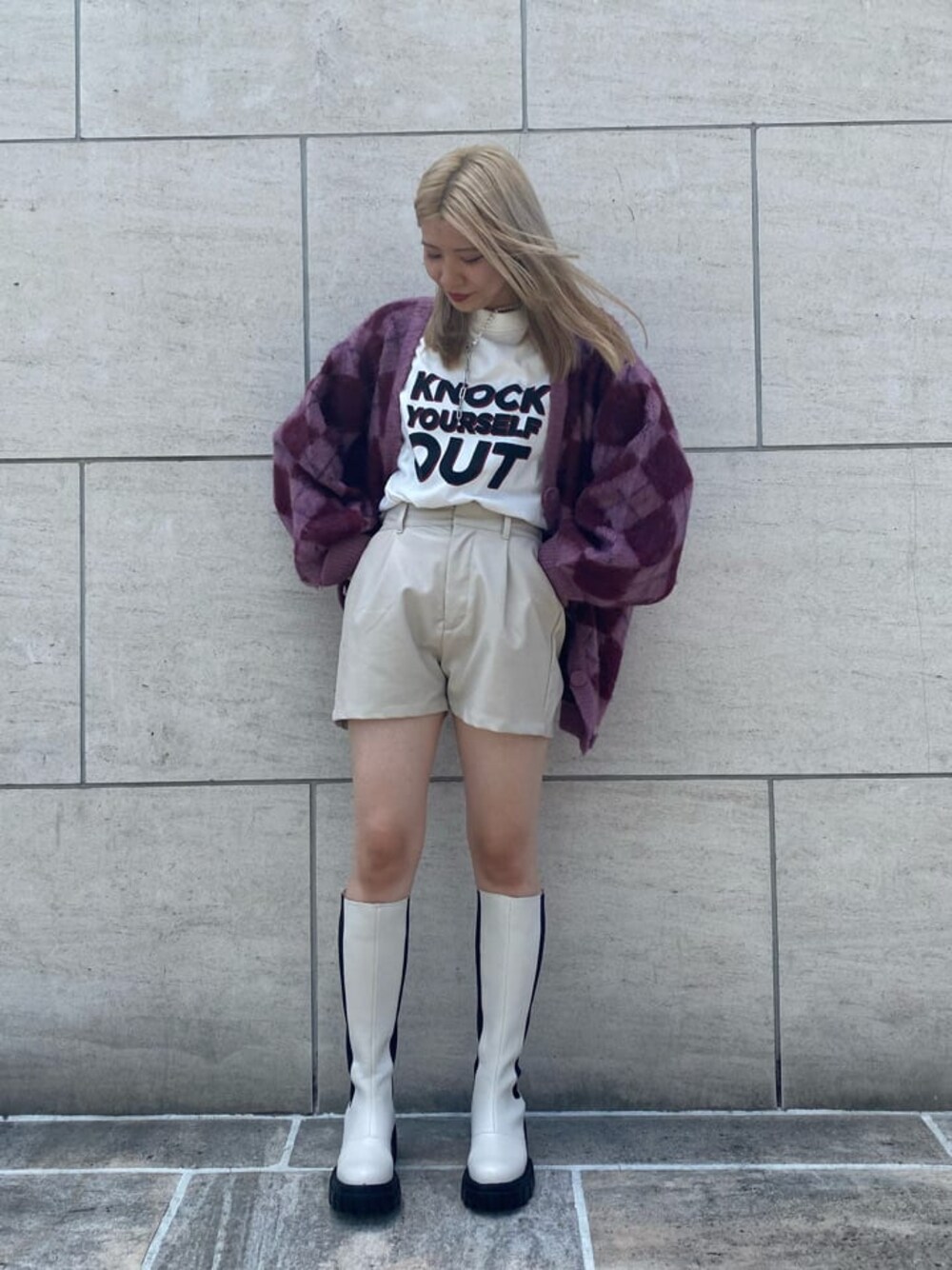 WHITE × PINK !! 【カーデ】メンズライクなオーバーサイズですが、スリーブのシルエットが女性らしさも出してくれます!丈は、161cmでお尻が隠れるくらいです。チクチクもせず、着心地の良いカーディガンです。 【Tシャツ】セットアップアイテムのTシャツを着回しました。インしても、ロゴを綺麗に見せられる優れものです! 【ボトムス】脚長効果抜群のキュロット!珍しいホワイトのレザーで、大人っぽさも出せます◎ 【ロングブーツ】普段23.5で、Mサイズ着用。後ろがジップになっているので、着脱が楽ちんです!また、すごく軽いアイテムなので、疲れず長時間履いていただけます。