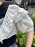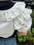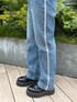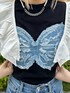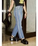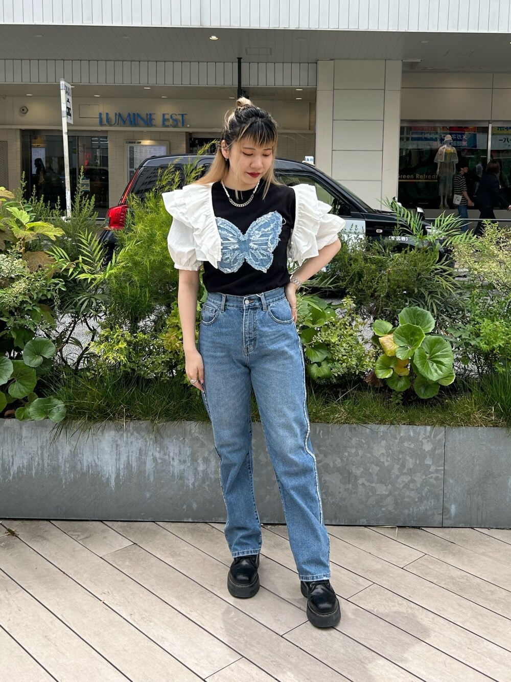 ガーリー✖️カジュアルMIXコーデ! 【ブラウス】フリルが可愛いショートブラウス!普段のTシャツコーデに、1アクセント✨風通し良い生地感なので夏でも涼しく着られます。 【Tシャツ】デニム生地のバタフライが可愛いフィットTシャツ!1枚でも主役級に可愛く着られます。スカート合わせも可愛いです。 【ボトムス】161cmでMサイズ着用。サイドのキラキララインが可愛い!ストレートデニムなので少しゆったりしています。