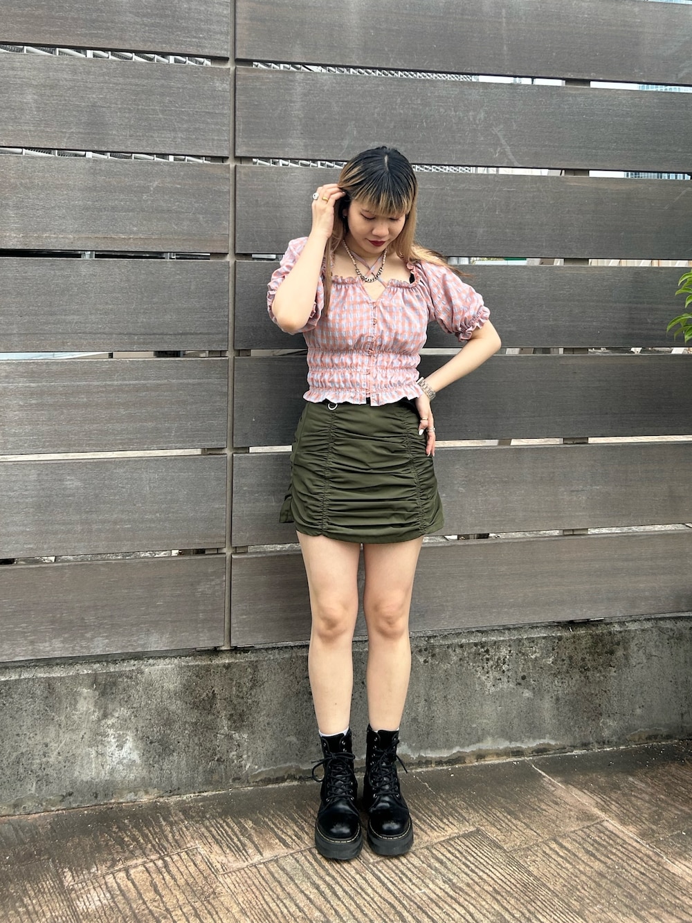 カラーを取り入れた甘辛コーデ✨ 【トップス】2wayでオフショルとしても使える万能ブラウス!羽織にしてあげても可愛いです! 【ボトムス】ミリタリーなデザインのミニスカート!ベルトとセットです!シルエットがとても綺麗でオススメです♡