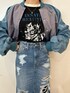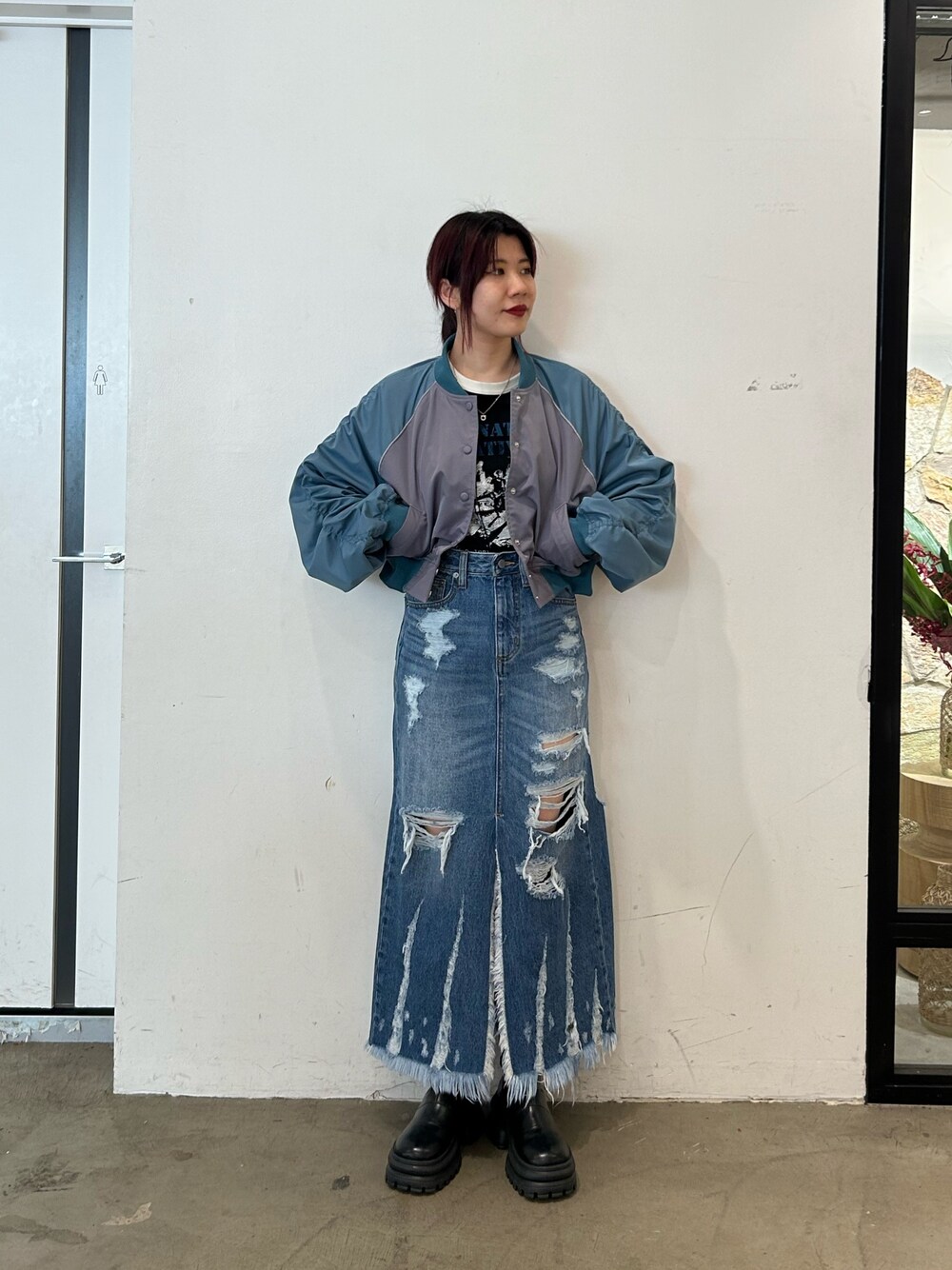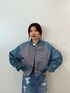 カジュアルなブルーコーデ🩵 【アウター】ショート丈のブルゾン!バイカラーで可愛い◎ショート丈ですがゆるっとしてるので使いやすいです。 【トップス】ロックなテイストのラグランTシャツ!七分袖のジャストサイズです! 【ボトムス】161cmでSサイズ着用。前後にダメージも入っていて360°可愛い♡スリットも入っているので、大人っぽく着られます。