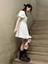 バレイコアを取り入れた甘辛コーデ🎀 【ワンピース】ボリュームスリーブのワンピース!女の子らしくて可愛い!腕も細見えする優れもの⭐️胸元のリボンもかわいい! 【トップス】クロップド丈のTシャツ!ロックっぽいプリントが可愛い♡肌触りのいい柔らかい生地感です! 【ボトムス】レースアップバイカーパンツ!トレンドのレース感が可愛い♡