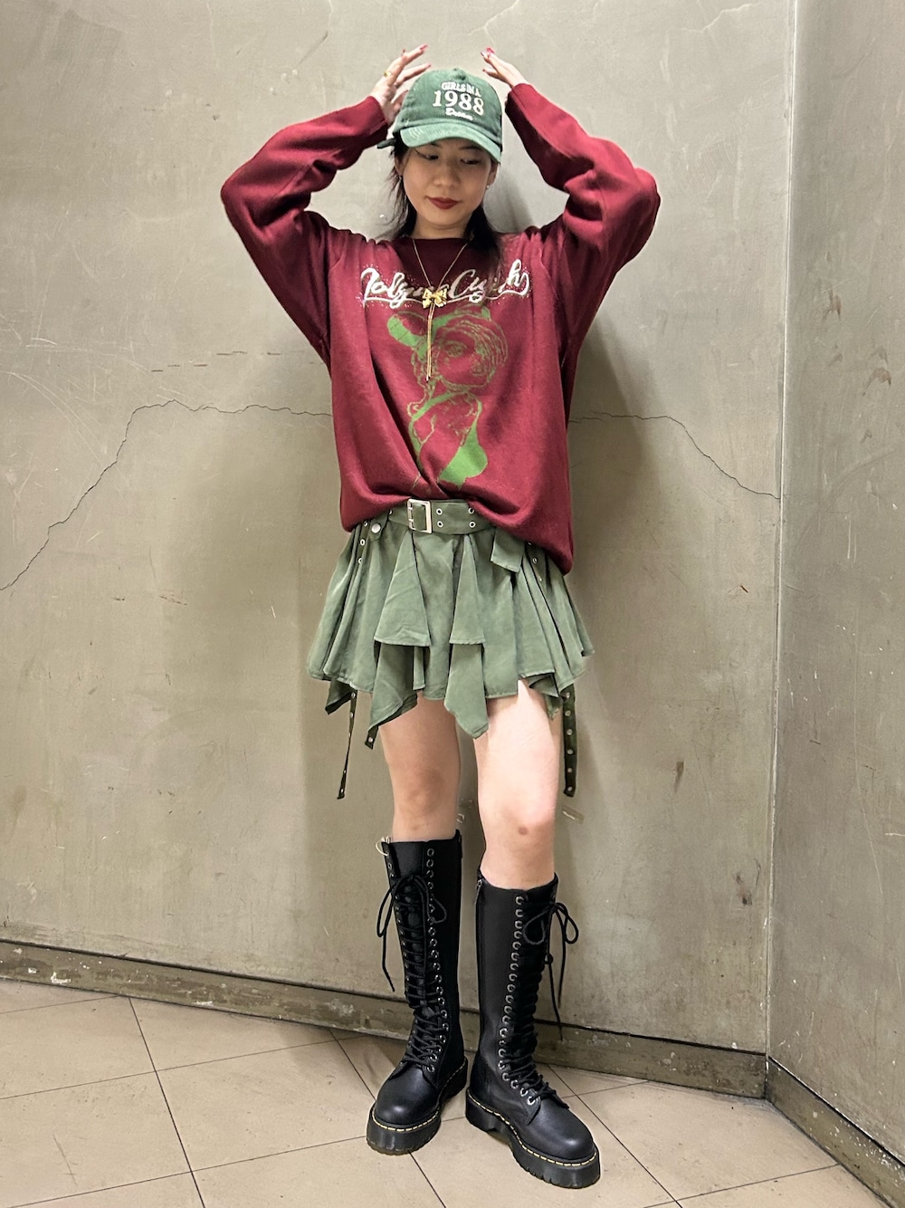 JOJOコラボ⭐️ 【トップス】さらっとした生地感のニット🧶JOJOデザインが、jouetieらしさもあって可愛い◎161cmで、お尻が隠れるくらいの丈感です。 【ボトムス】ローライズのスカパン!秋っぽいさらさらした素材感です。歩くとヒラヒラしてとても可愛い! 【ブーツ】Dr.MartinsのUK4着用。皮が柔らかめなので、靴擦れ安心!