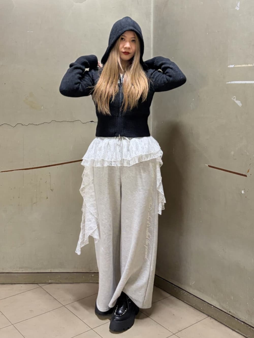 【トップス】もちもち素材のコンパクトニットフーディー!ビジューがjouetieらしくて可愛い! 【ボトムス】レースがドッキングされたスウェットパンツ!太めなシルエットが可愛い◎ 【シューズ】Lサイズ着用。