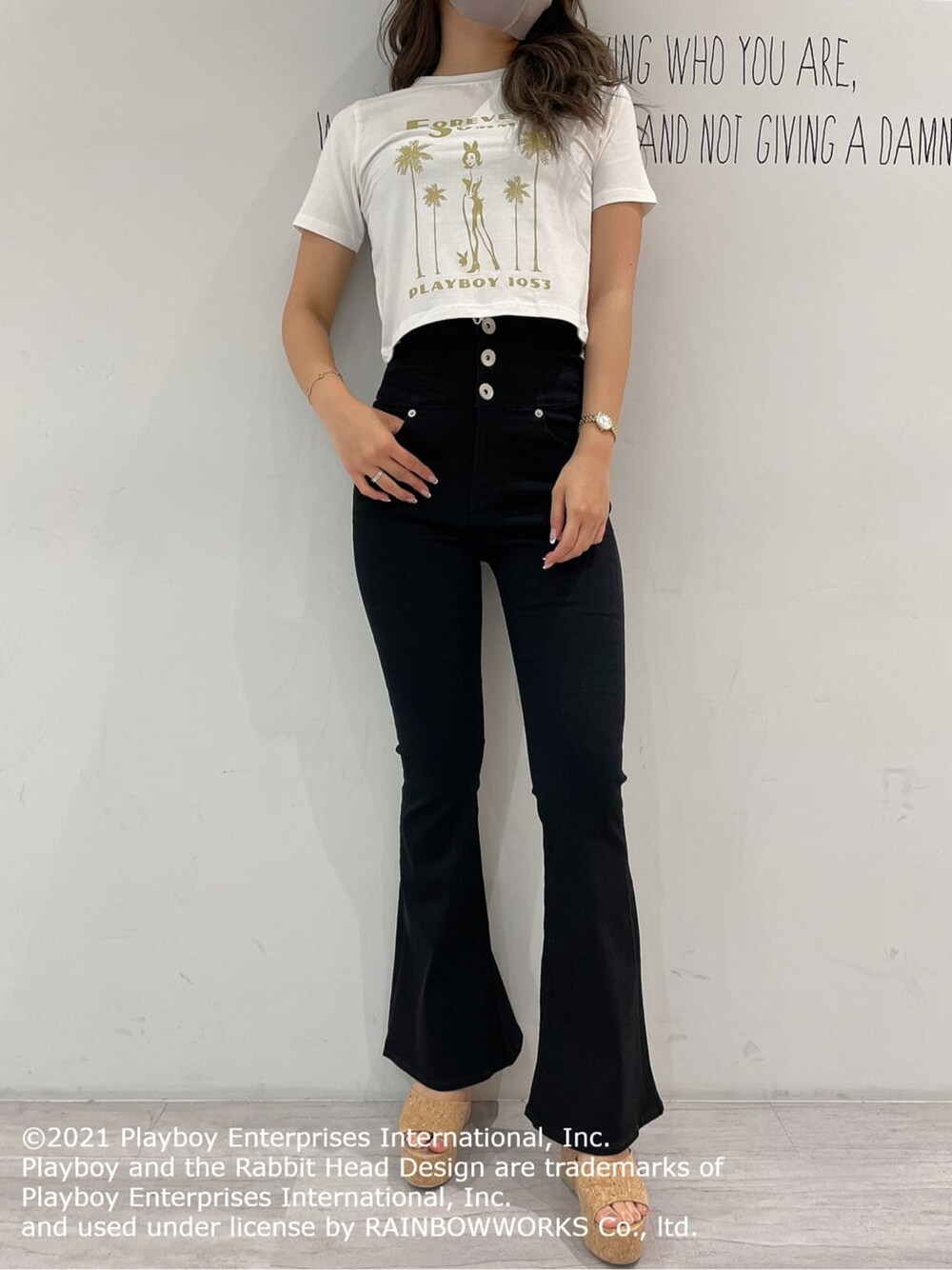 PLAYBOY FOREVER SUMMER ショートTシャツ♡ショート丈でコンパクトな形なのでボトムスが選びやすいです。今回はシンプルにハイウエストボタンフレアパンツと合わせてカジュアルな着こなしをしました✨️夏らしいプリントが施されており、海などに着て行っても可愛いと思います♡今季流行りのビビットカラーでオレンジもイチオシアイテムです!綿95%と伸縮性のある素材で着心地もよく通気性抜群なのでこれからの季節にピッタリです。デニムもストレッチ性が効いていて、何より形が綺麗で脚長効果抜群でクローゼットにあれば思わず手に取ってしまいます♪カラー展開も可愛く通年使って頂きやすいベーシックなデザインになっています♡