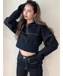 大人っぽカジュアルコーデ❤︎バックスタイルのレースアップデザインがGYDA(ジェイダ)らしいポイントです。ハリのあるポンチ素材がモードな印象のショートパーカー。モチモチとした生地は肌触りが良く着心地のよいアイテムです✨️ポンチ素材は綺麗め、カジュアルにも使え幅広いスタイリングに活躍します。私はハイウエストのデニムパンツを合わせたカジュアルなスタイリングが推しコーデです♡首元にはチャックが付いていますが閉めるとかっこよく、開けると抜け感があり雰囲気を変えて着用できます。今年流行りのスウェットSETUP風にするのもカジュアルやストリート系が好きな方には是非オススメなコーディネートです♡