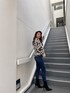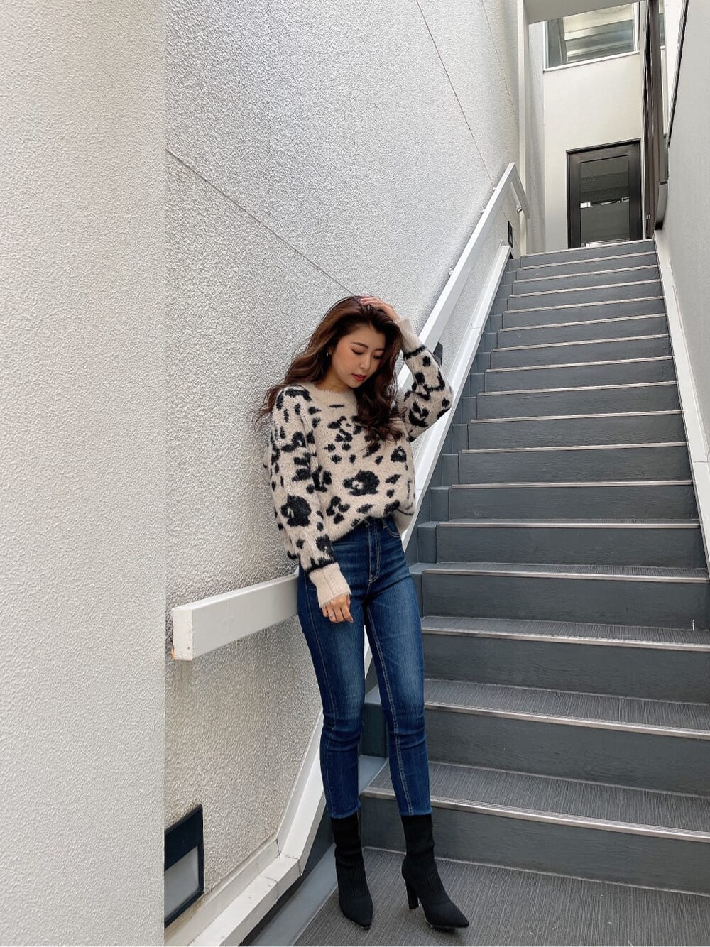 シャギーニットの柔らかい雰囲気が可愛いレオパードニットです❤︎レオパードですがシャギー素材になっている為強くなり過ぎず、袖裾のラインデザインがポイントのニットです。少しオーバーサイズなのでデニムなどと合わせる際は前を少しボトムスにINして頂くとスタイルアップ効果も◎首元は少しゆとりのあるUネックなので苦しくなく、抜け感を演出してくれます✨️少し強めなコーデがお好きな方はレザーのボトムス合わせがオススメです♡デニムは毎年大人気のパウダースキニー!今年はハイウエストになって登場しました。ウォッシュ加工に拘られておりシェービング効果があるため美脚効果抜群です!