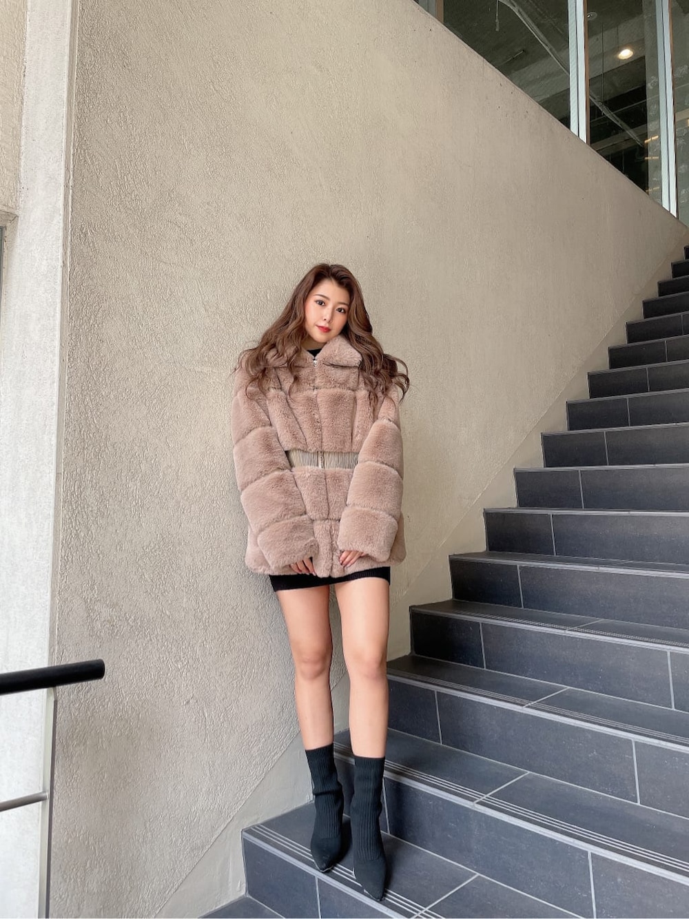店頭でも大人気のファーコートです❤︎フェイクレザーの切り替えを入れることにより表面感にエレガンスな印象をプラスしてます✨️ウエストのギャザーデザインでよりシェイプにスタイルアップして見えるようなデザインです!エコファーですが、肌触り抜群でついつい触ってしまう生地感になっています。襟もありファスナーを上まで閉めると防寒効果抜群のアイテムです。
