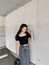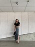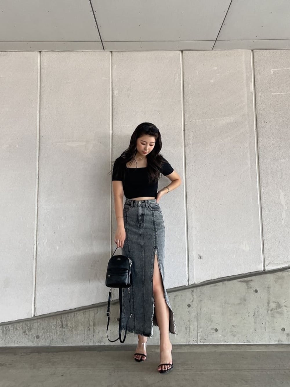 ブラックコーデ❤︎ 【TOPS】デコルテが綺麗に出るスクエアネックのデザインです。カップ付きなので下着いらずの一枚で着用して頂けます。【スカート】サイズはSを着用していますがお尻が少しきつくウエストは少し余裕がありました。前のZIPでスリットを調節して頂けるのが可愛いポイントです♡ 【クリアサンダル】トレンドのクリアヒールサンダルは前がクリアだけではなくカラーの細い紐がある為カジュアル目なお洋服に合わせて頂いても相性抜群です!【リュック】GGパターンを型押しした流行りの総柄で人気の4wayリュックが新作で登場しました。少し小さめなのでワンピースなどに斜め掛けをするのもおすすめです♡
