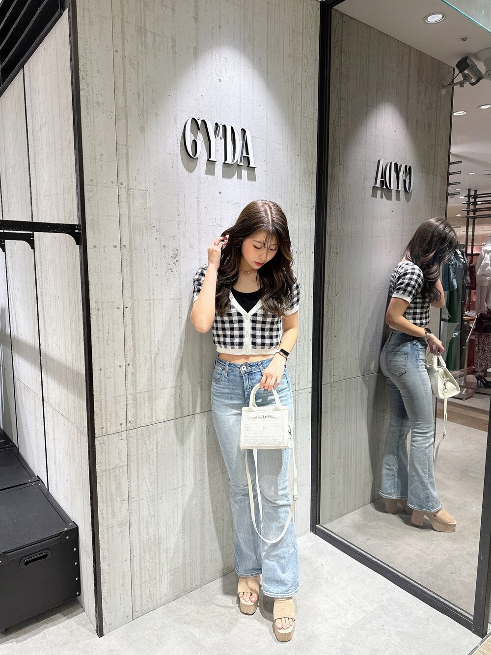 春先取りコーデ🌸【Tシャツ】インナーとしてるトップスは前後2wayのベーシックで着回し抜群のアイテムです♡今年はUネックの方にGGロゴが入っています!【カーディガン】サラッとしている薄手のニットになっています。158cmの私でおへそが見える丈感でした。【デニム】ベーシックデザインのフレアパンツは158cmの私でぺたんこ靴でも、着用可能でした!お尻ポケットにGGロゴが入っているのも推しポイントです。【バッグ】新作のカゴバッグの様なデザインのミニbagが登場しました!肩紐も付いているので斜め掛けをしても可愛いです♡【サンダル】毎年大人気のコルクサンダルが今年は今までとは違う太めのヒールになり登場しました✨️軽くてとても履き心地抜群です。23cmで足の幅狭めでSサイズ着用しています。