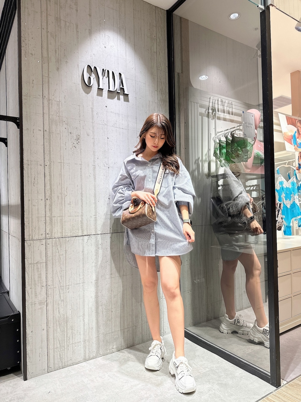 BBQコーデ♡ 【トップス】トレンドのストライプシャツは今期ポケットの横にGGロゴの刺繍が入っております✨️ボリュームスリーブのデザインが可愛くサイズ感が大きめなのでワンピース風でも羽織でも可愛く着用して頂けます❤︎サラッとしているので真夏でも日焼け防止としてもお使いいただけます! 【スニーカー】ソール5cmヒール6.5cmと厚底ですが、とにかく軽く足が盛れます!低身長の方でも身長が6.5cmも盛れるので是非スニーカーにチャレンジしてみて下さい✨️