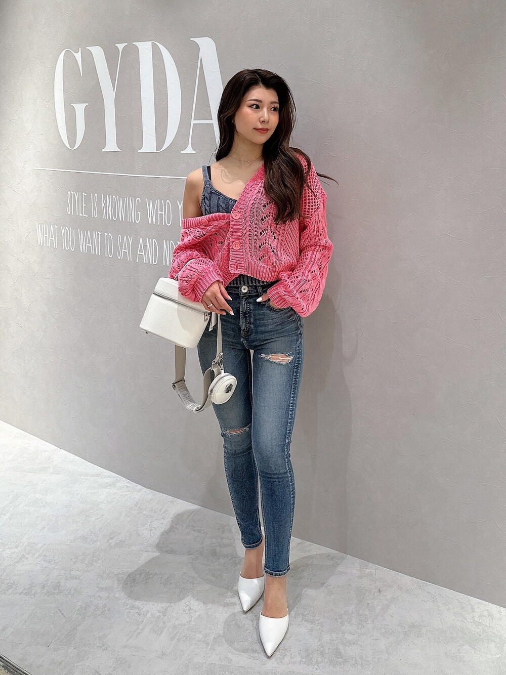 春先取りコーデ🌸 【トップス】キャミとカーディガンそれぞれお好きな組み合わせで着用して頂け、夏まで長く色々な着回しを楽しんでいただけます。 【デニム】ハイエンドシリーズでスキニーは特にストレッチが効いているので普段のワンサイズ下でも問題なく着用頂けると思います。シンプルなダメージなのでキレイめコーデとも相性抜群です。 【ミュール】 GYDAで大人気のポインテッドミュール♡低反発クッションなので他のミュールと比べてもとても歩きやすい◎デニムやフレアパンツやロンパースなど幅広いコーデに活用出来るので重宝するアイテムの1つです!23cm / Sサイズ着用♡ 【バッグ】新作のバニティバッグはサイズ感が大きく2つ折りの財布もすっぽり入るサイズ感です✨️