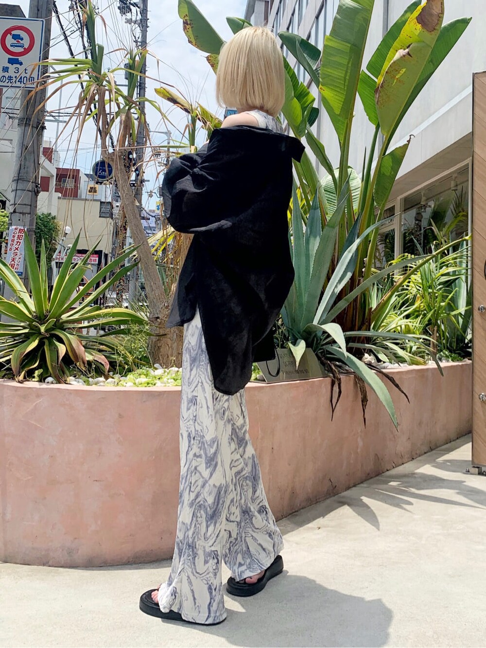 トレンドのシアーシャツを使ったコーデ♡ シャツはお尻まですっぽり隠れるオーバーサイズで、黒でも透け感があるので重たくなりすぎず夏場でも使っていただきやすいです♩ プリーツ素材のセットアップは、夏らしい涼しい素材感で、しわなども目立ちにくいので楽に着ていただけます! パンツもシルエットが出にくいのに脚を細く長く見せてくれる効果があるので、楽に美脚見せできます♡ こういう夏らしい楽なコーデには絶対ストラップサンダル!! ぺたんこデザインだけど少し厚底なのでカジュアルになりすぎず、きれいめなスタイルでもお使いいただけます♩