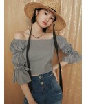 最近の店頭コーデ♡ オフショルのゴムがしっかりしててズレてこないから安心して着ていただけます! ショート丈なのでハイウエストのボトムと合わせるのがおすすめ♪ 私は安定のショートパンツで♡笑 ちょっとガーリーなデートコーデとしてもお使いいただけます♡♡