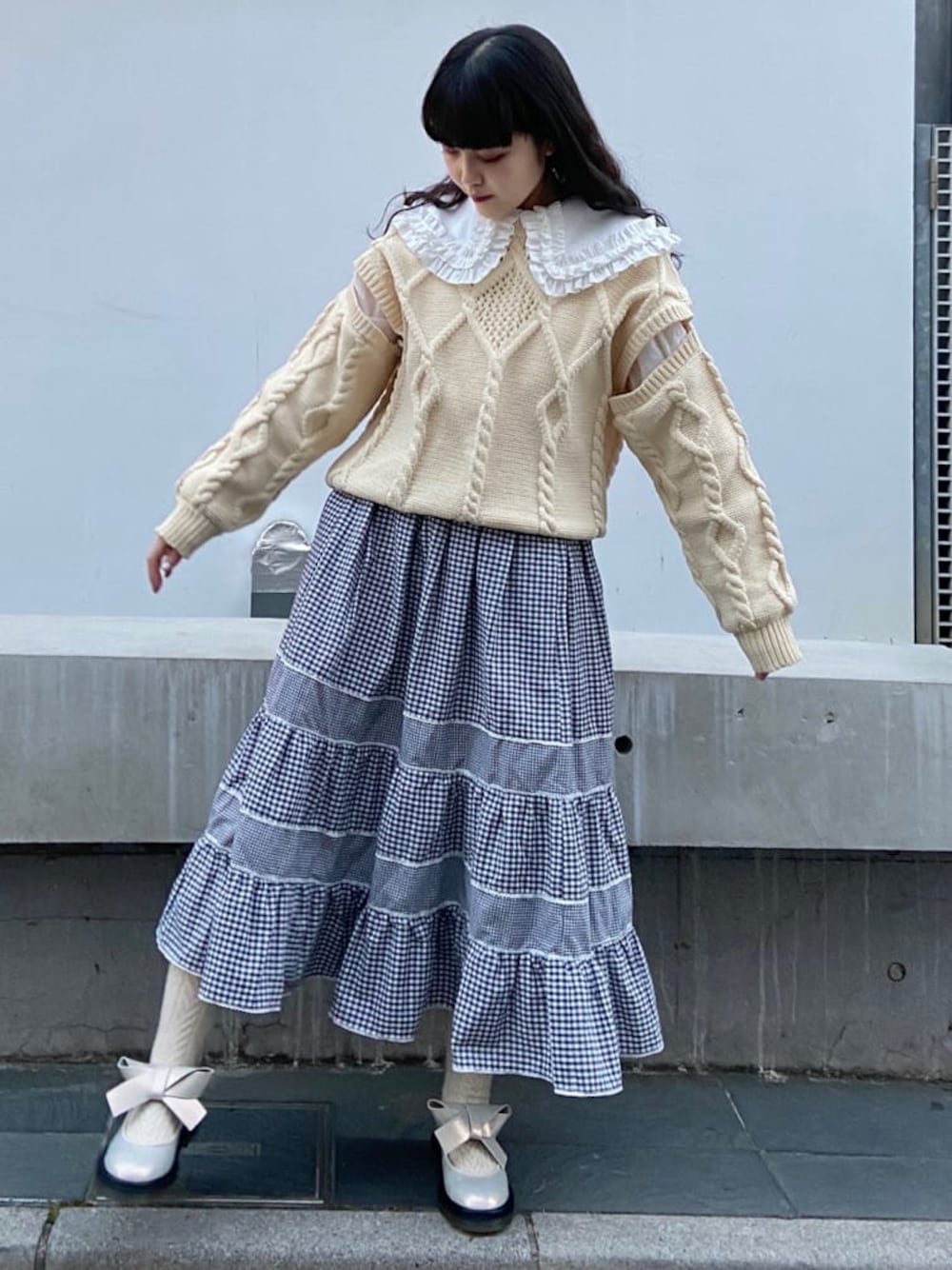 ◌ガーリーチェックコーデ◌個性的なニットをレイヤードさせた春におすすめのコーディネートです!トップスはブラウスにニットを重ね、襟を出しガーリーな印象に♡ブラウスはニットやカーディガンを重ねるとより襟が目立つので重ね着がとてもおすすめです◎ニットは袖にスリットが入っている少し個性的なデザインに♡中のインナーや腕をチラッと見せられる可愛らしい1枚です!スカートはギャザーが寄ったふんわりとしたフレアスカート。生地をたっぷり使っているので動いた時のふんわり感がたまらない1枚です♡丈感は156cmで足首が見える長さです!シューズはよりガーリーな印象にする為に大きなリボンのラバーシューズを合わせました♡