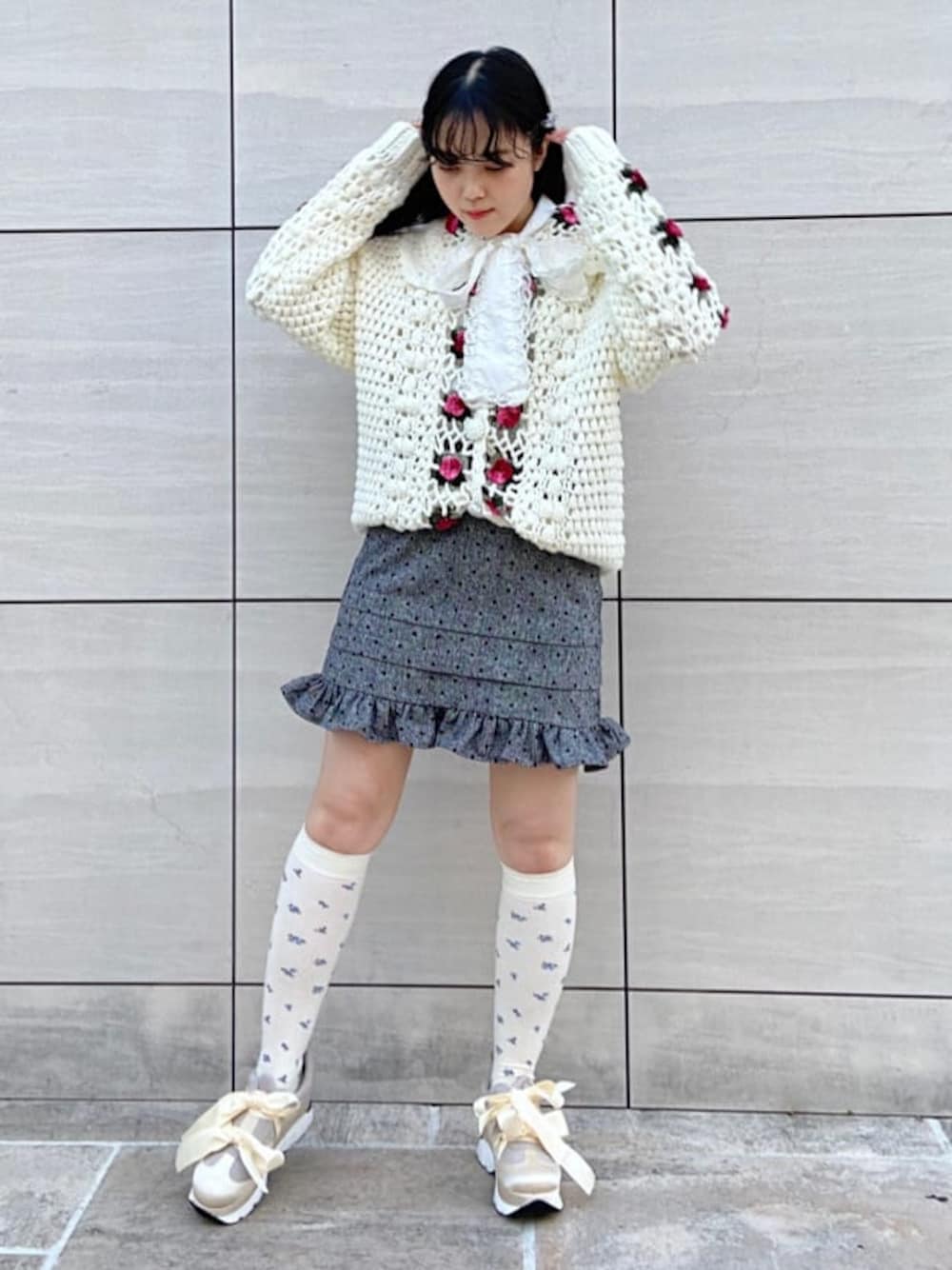 ◌お花畑コーデ◌お花のカーディガンを主役にしたコーディネート。トップスはブラウスにニットカーディガンを合わせました!ボウタイブラウスのリボンをカーディガンから出し、より可愛らしい印象に◎ニットカーディガンは厚みがあるので春先のアウターにもおすすめです!スカートは裾にフリルが付いた可愛らしいデザイン。丈感は156cmで膝がしっかり見える長さです!シューズはリボンが印象的な厚底スニーカーを合わせて脚長効果に!ミニスカート履きなれてない方は厚底スニーカーやヒール合わせがおすすめですよ!