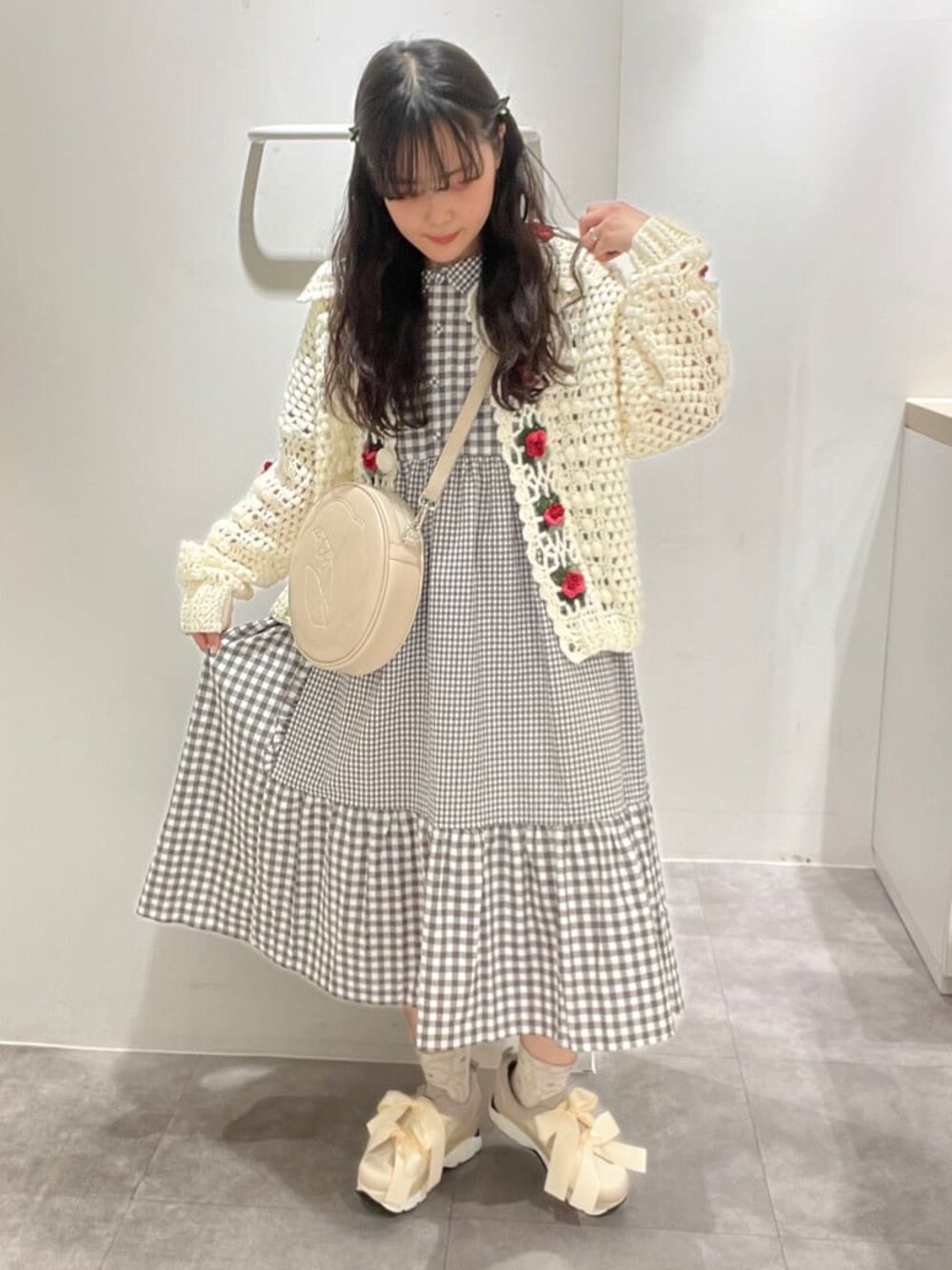 ◌夏に向けたギンガムチェックコーデ◌今から使える半袖ワンピースのレイヤードコーデです!主役のワンピースはスカラップカラーのギンガムチェックワンピース。大小異なるチェックを組み合わせた個性的でmerry jennyらしい1枚。スカラップカラーで顔周りを華やかに!そして少し大きめ襟で小顔効果に◎丈感は156cmで足首見える丈感なので重たい印象になりません!靴下も見せられるので色物を取り入れてオシャレに♡半袖1枚で寒い時期には今回のようにカーディガンを合わせたレイヤードスタイルがおすすめ!厚手のニットカーディガンなので春のアウターにぴったり◎お花がたくさん咲いているので1枚羽織るだけで華やかな印象にしてくれます♡そしてカーディガンに合わせてバッグもお花の模様のショルダーバッグを選びました!大容量でペットボトルも入る優秀なアイテム◎ショルダー部分で長さの調整も出来るのでお好きな長さに!シューズはよりmerry jennyらしさを出すために定番のリボンシューズを合わせました!5cm厚底で可愛いのにしっかり盛れます♡少し大きめのサイズ感なのでワンサイズ下げてもいいかと思います!小物は白で合わせて統一感を出しました♡