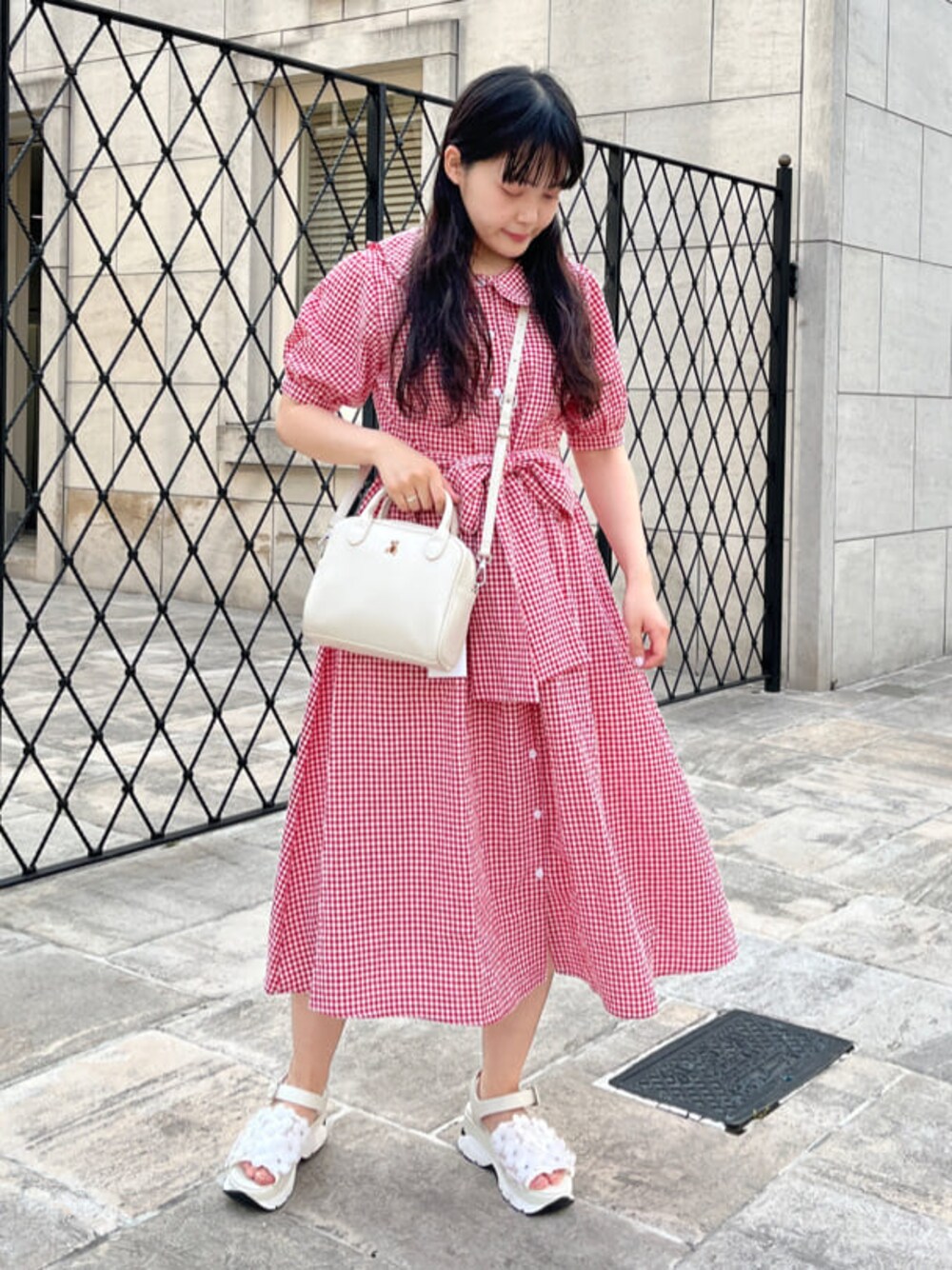~夏らしいギンガムチェックコーデ~赤のワンピースを主役にした夏におすすめのコーディネート♡ウエストが細くなっているデザインにリボンを巻くことで更にスタイルアップに。ガーリーさも増すので可愛らしいコーデがお好きな方は前リボンがおすすめ♡小物はワンピースが引き立つように白のアイテムを合わせました!