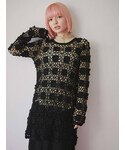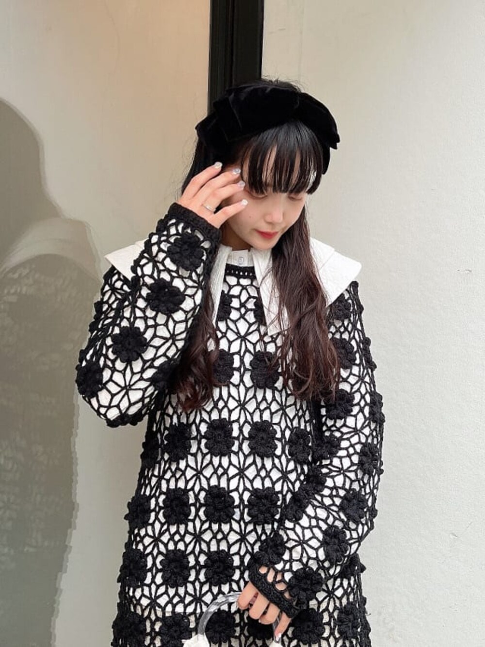 ~black×white~全体的に黒と白でコーディネートしました。ニットはヒップもしっかり隠れるでヒップ周りが気になる方におすすめ。また上の方に目線が行くようにカチューシャや大きな襟のブラウスを合わせてスタイルアップに。