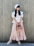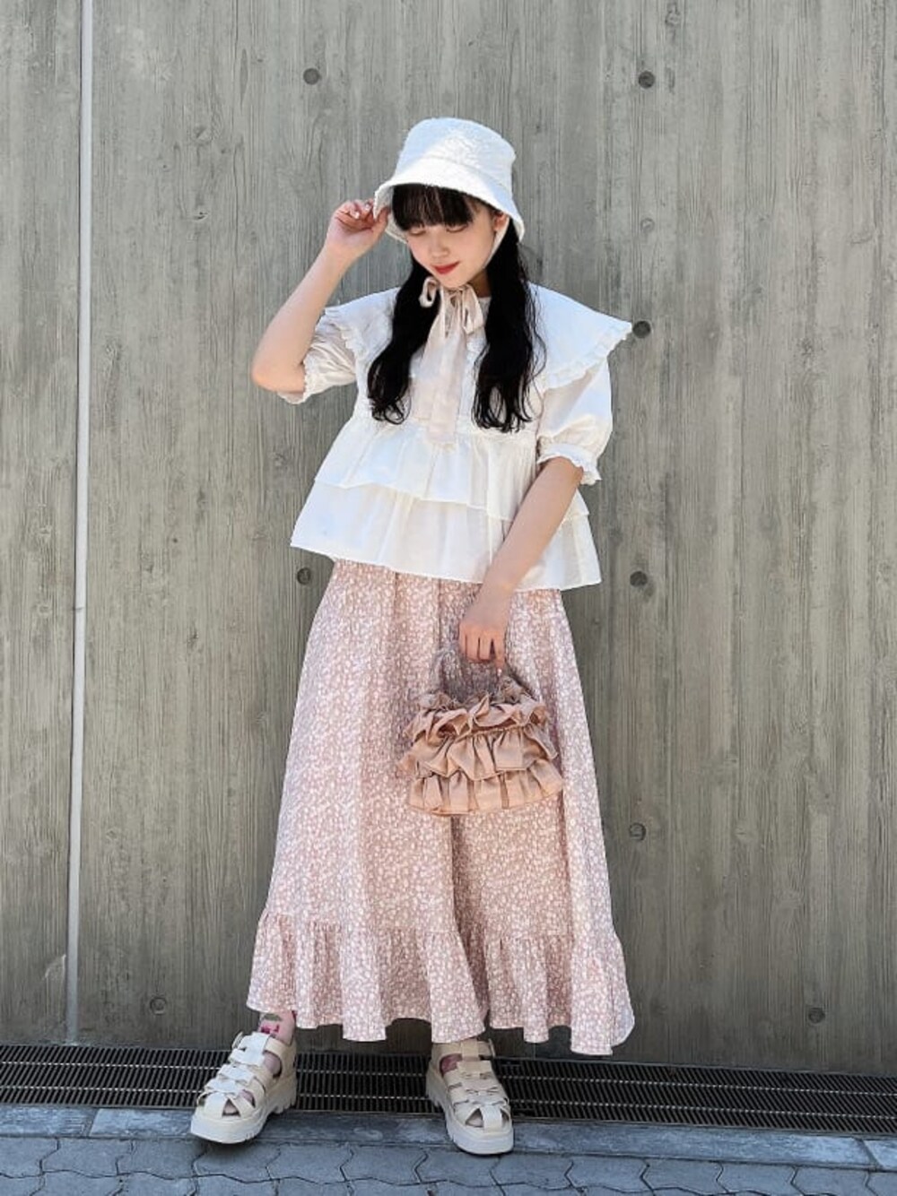 ~カジュアル×ガーリー~ふんわりとしたティアードのブラウスは大きな襟が特徴的。フリルをたくさん使用しているので、より甘く可愛らしいコーデに♡裾広がりの花柄フレアスカートを合わせて更にふわっとした印象に。バケットハットやグルカサンダルでカジュアル感も出し、甘すぎないコーディネートに仕上げました!