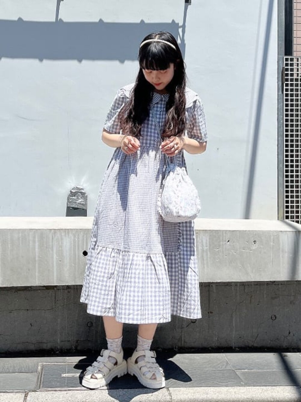 ~夏らしいギンガムチェックコーデ~主役のワンピースはスカラップカラーのギンガムチェックワンピース。大小異なるチェックを組み合わせた個性的でmerry jennyらしい1枚。スカラップカラーで顔周りを華やかに!コーデ全体が淡い色合いになるように小物は優しい色のアイテムを選びました♡