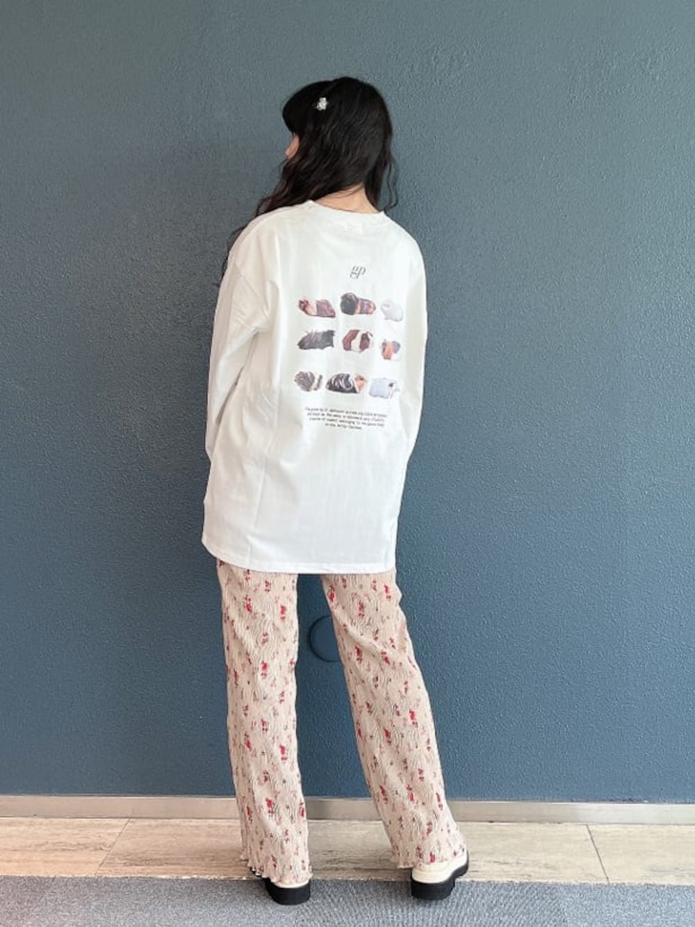 ~ゆったりらくらくコーデ~ オーバーサイズのロンTは背中にモルモットがプリントされた可愛らしいデザイン。胸元には英語でモルモットという意味の″gp″が刺繍されています♡パンツはくしゅくしゅとした伸縮性のあるフレアパンツ。裾にかけて広がりがあるので足を細く見せることが出来ます◎全体的にゆるっとしているので、ヘアピンを付けて可愛らしさをプラス。